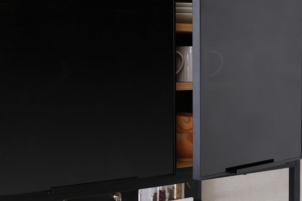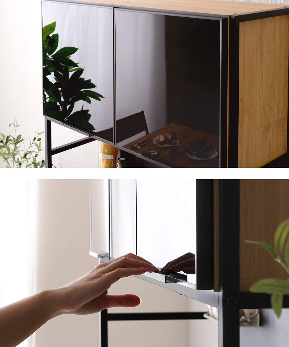 艶を抑えた鏡面ガラスは、焼付塗装仕上げです。深みと耐久性を兼ね備えた質感です。中の物が見えにくく、生活感をそっと包み込みます。ガラスフレームと一体となったスチール製の取っ手は、指先にやさしくなじみ、軽い力で開閉できます。