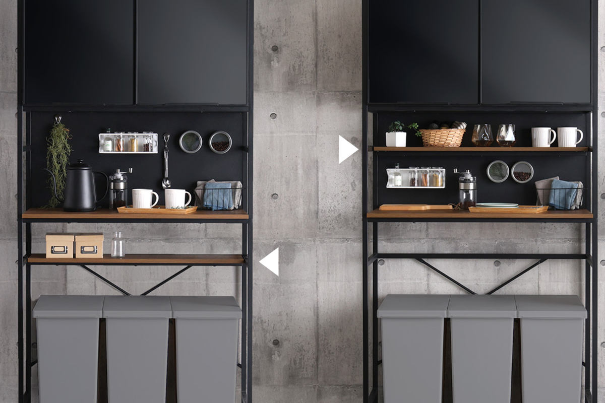 棚の位置を変えるだけで、収納の印象がガラっと変わります。見せる収納として使えば、道具や雑貨を美しくディスプレイできます。目隠し収納として活用すれば、生活感のあるものもすっきり収まります。