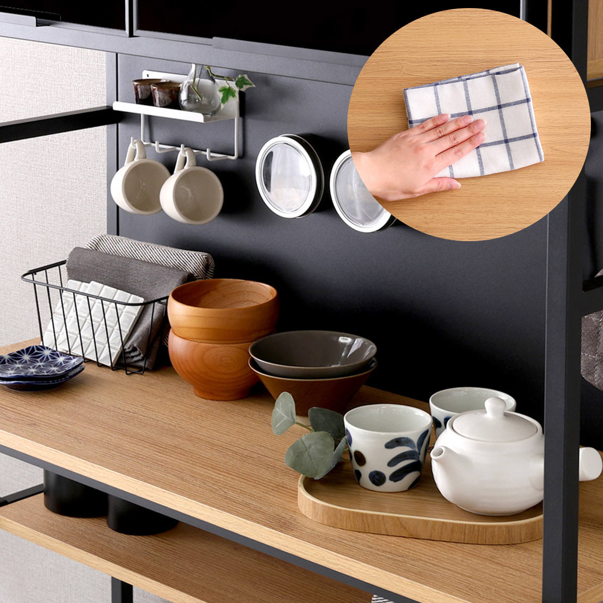 幅広の天板は、配膳やちょっとした手作業に最適なサイズです。奥のマグネットパネルを活かせば、必要なツールもすっきり美しく整います。木目調の天板は、水がしみ込む心配がないため、汚れてもサッと拭き取るだけでお手入れも簡単です。