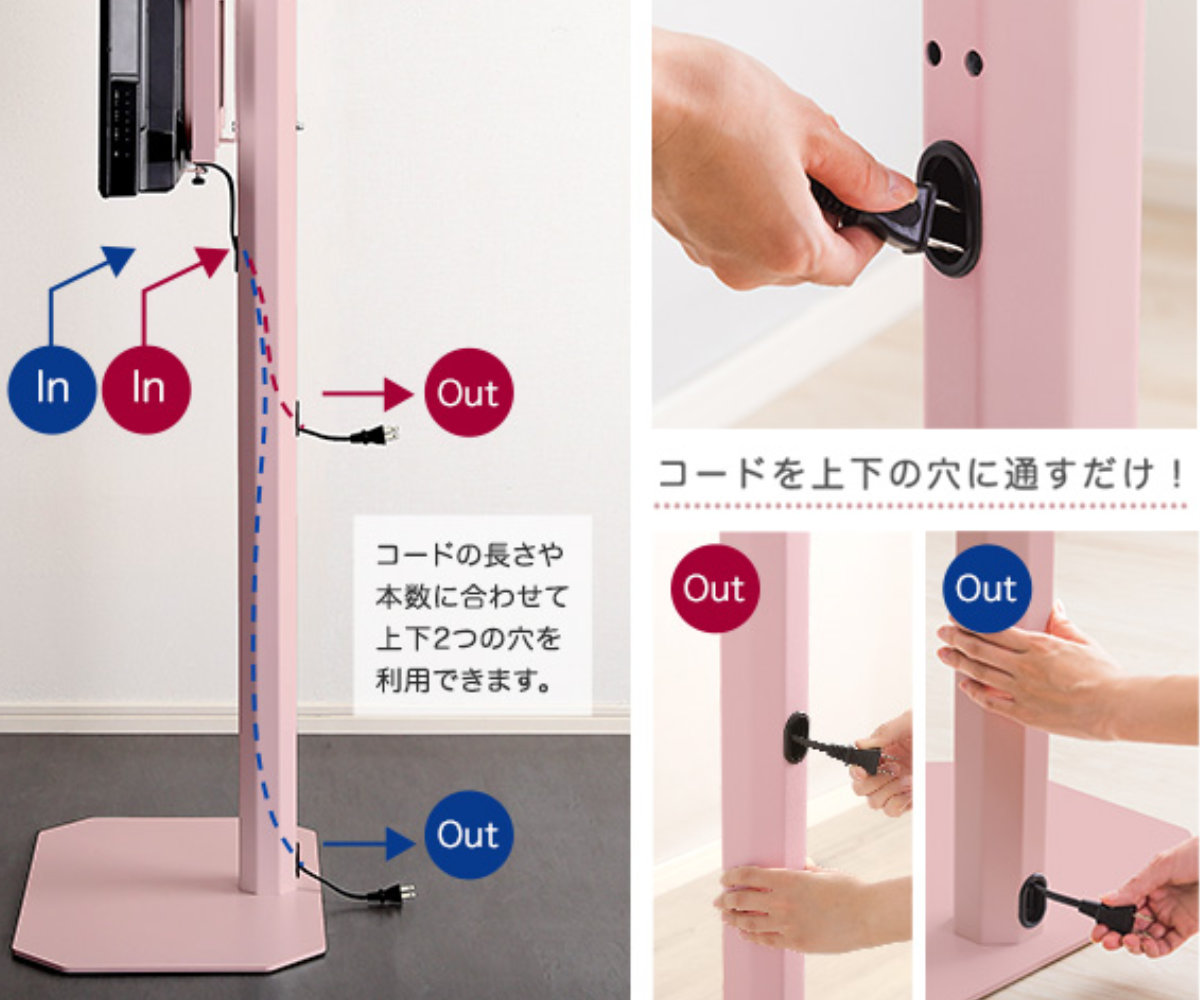 本体にコードを通せるので、テレビまわりの配線もすっきり。コードが見えにくいデザインだから、正面から見ても美しく、リビング全体が整った印象になります。