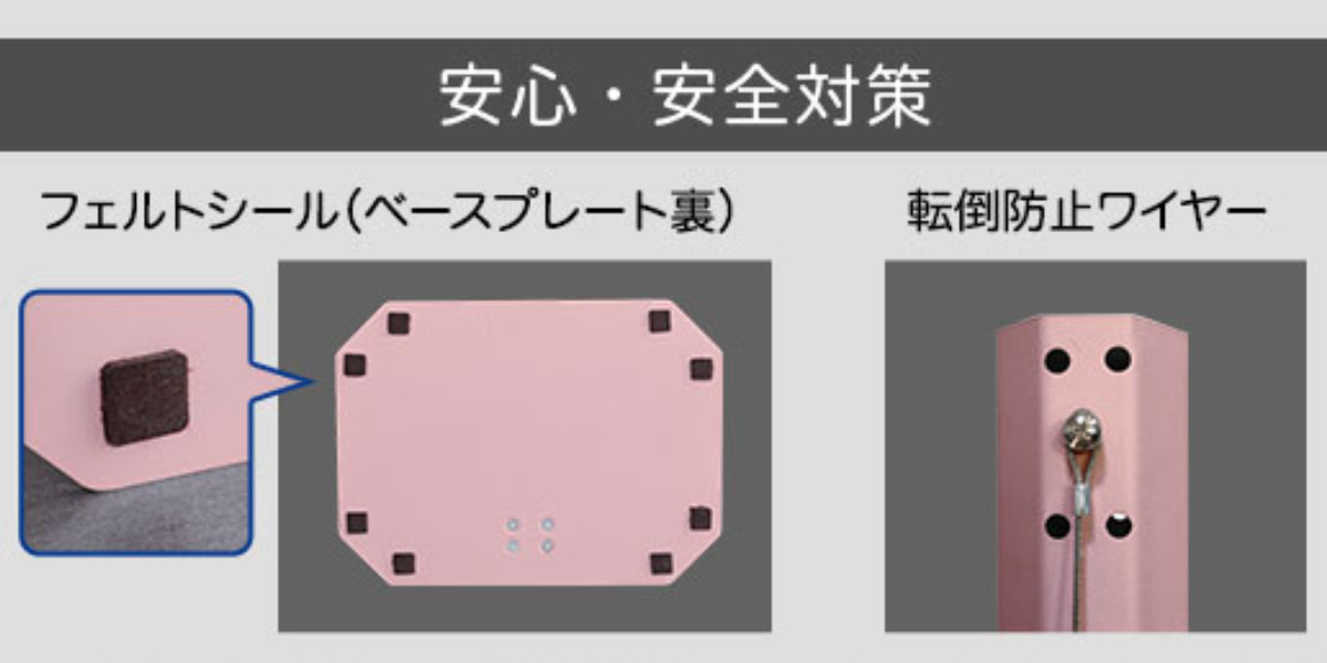 ベースプレートの裏面にはフェルトシールを施しているので、床を傷つけにくく安心。フローリングの上でもやさしく設置できます。付属の転倒防止ワイヤーで壁に固定できるため、より安定して設置できます。