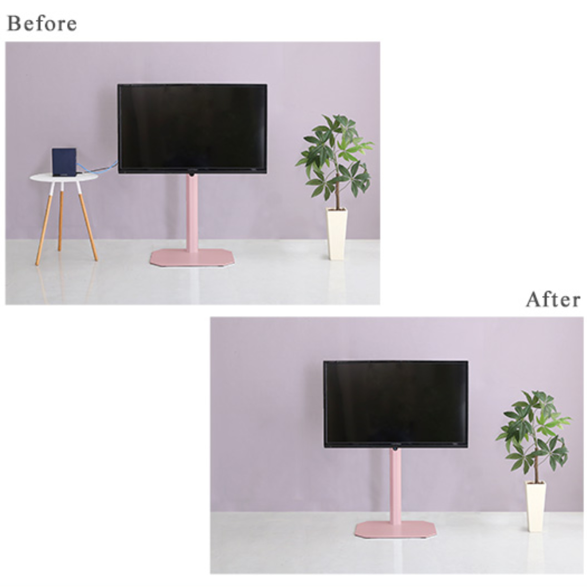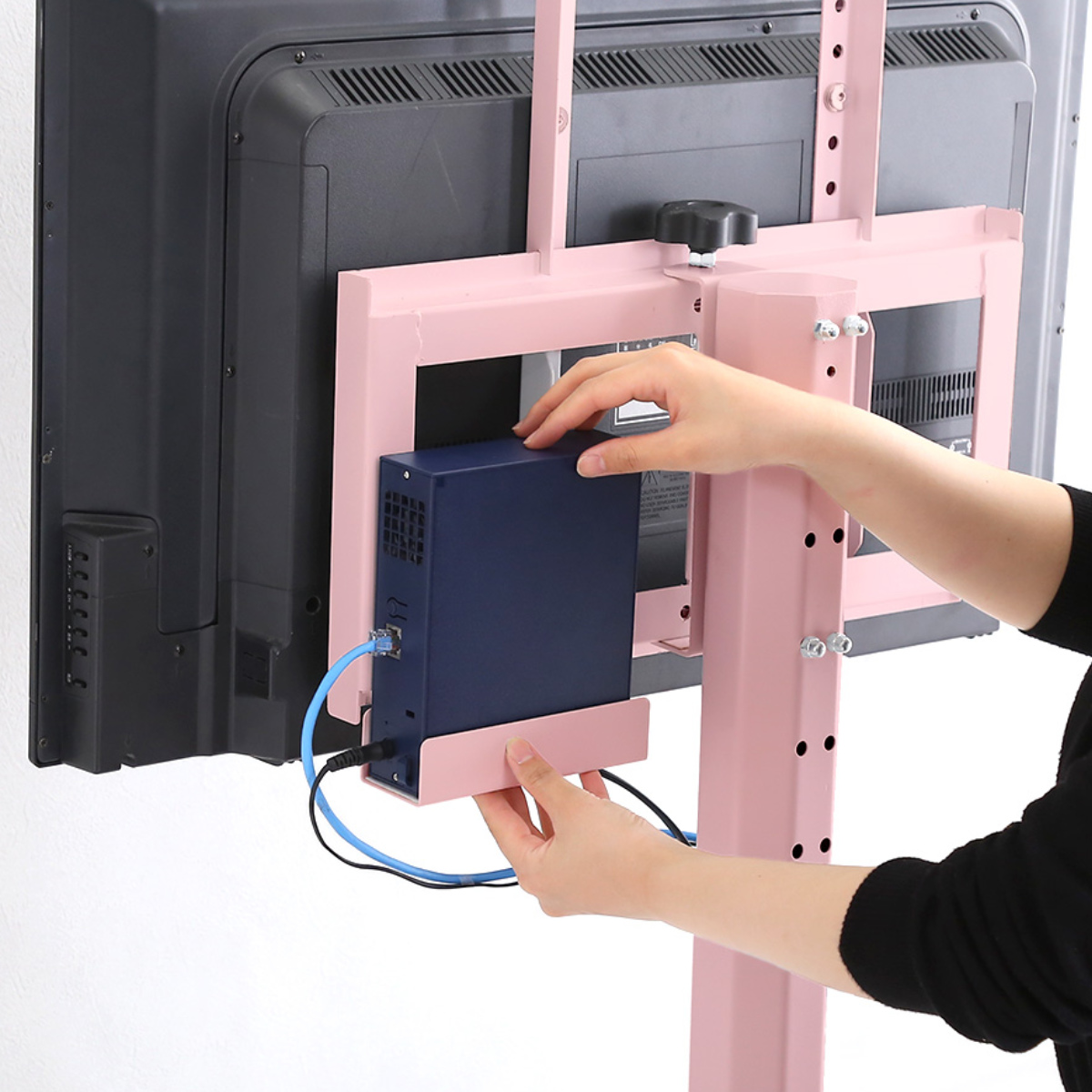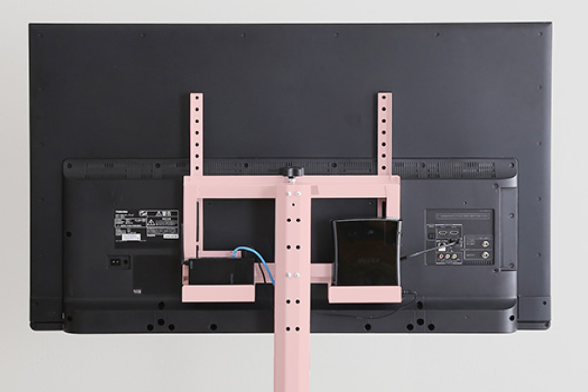 「テレビスタンド専用 ハードディスクホルダー 単品」は、テレビスタンドの背面フレームに、掛けるだけで設置可能。外付けHDD、Wi-Fiルーター、モデムなど、テレビまわりがさらに美しく整い、お部屋全体の印象もすっきりします。