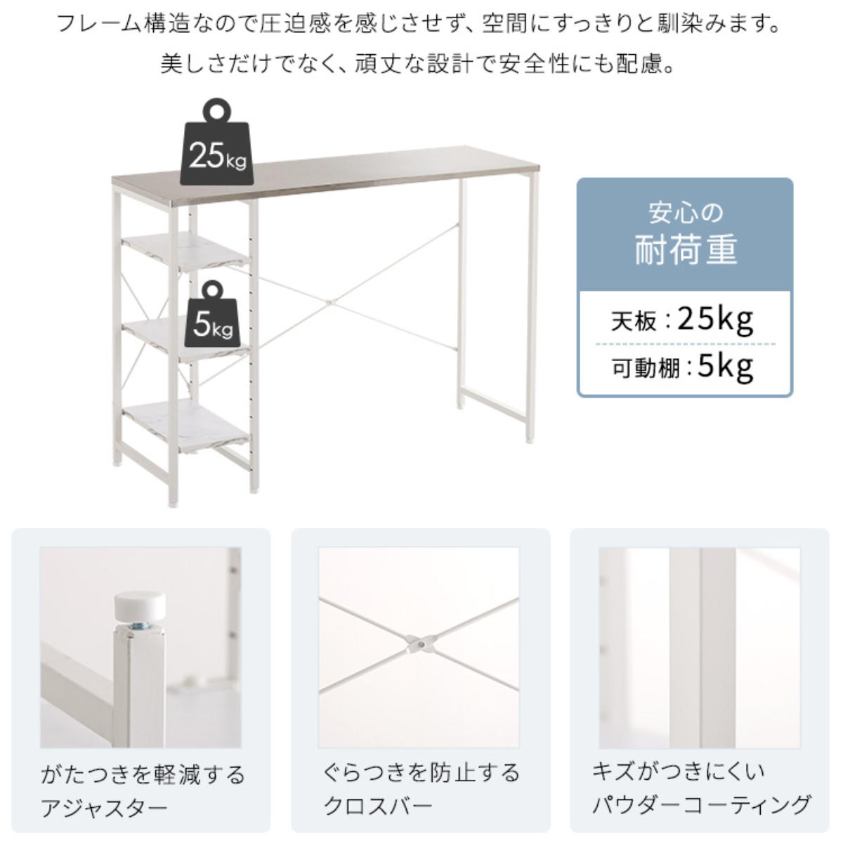 天板約25kg・可動棚(1枚あたり)約5kgの耐荷重でしっかり支えます。脚底のアジャスターでガタつきを軽減し、クロスバーでぐらつきを防止して安定性を高めます。