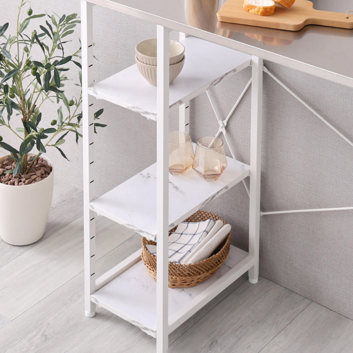 サイドのオープン棚は小物の収納に便利。大理石調天板で高級感を演出します。