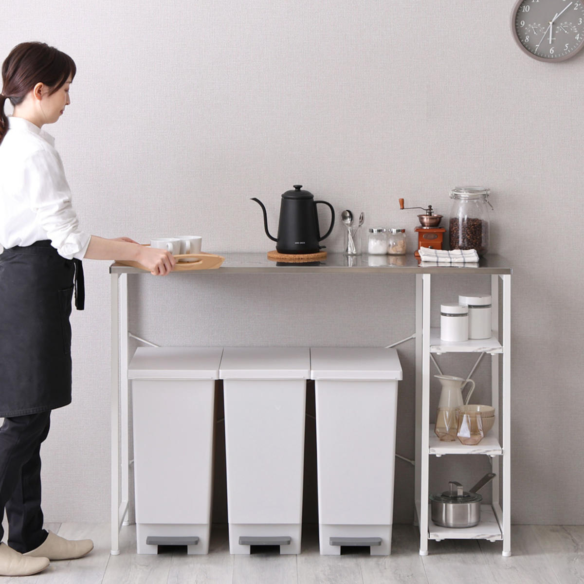 45Lスリムタイプのゴミ箱(幅26.5×奥行45×高さ55cm)を3つ並べて収納可能です。高さも十分あり、蓋の開け閉めにも邪魔になりません。