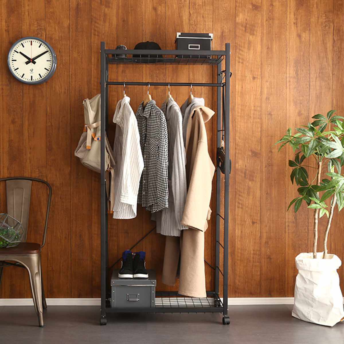 スタイリッシュなブラックフレームが目を引くハンガーラックです。シンプルながら高い収納力を備え、自由にレイアウトを楽しめます。衣類はもちろん、バッグや小物もすっきりまとめられ、お部屋の雰囲気を損なうことなく整った空間を演出します。