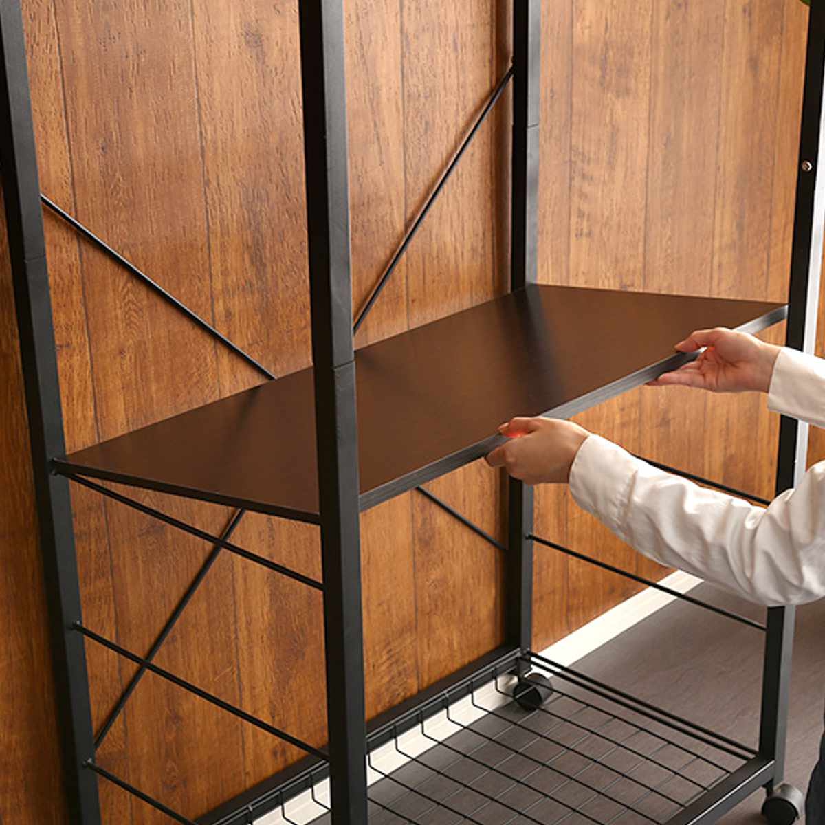 可動棚は置くものに合わせて高さを変えられ、鞄やベルト、小物などをきれいにディスプレイできます。棚板は裏面のくぼみをサイドフレームに引っ掛けるだけで、簡単に付け替え可能です。