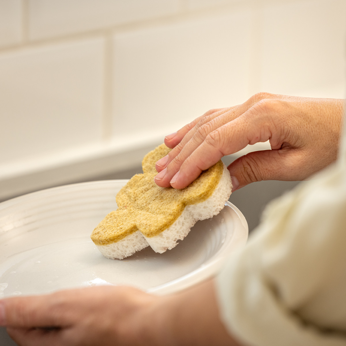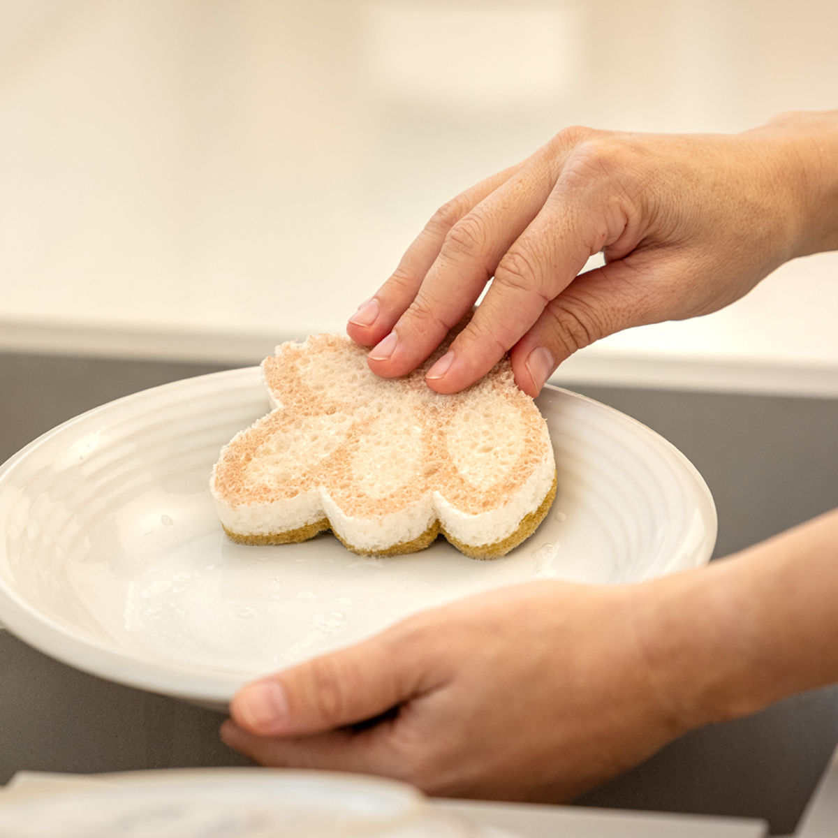通常の食器洗いで使うソフト面はセルロース繊維で柔らかく、高い吸水性と速乾性があります。頑固汚れを落とすハード面はサイザル麻を採用しており、ゴシゴシ洗いたいお鍋や汚れが強いものにおすすめです。