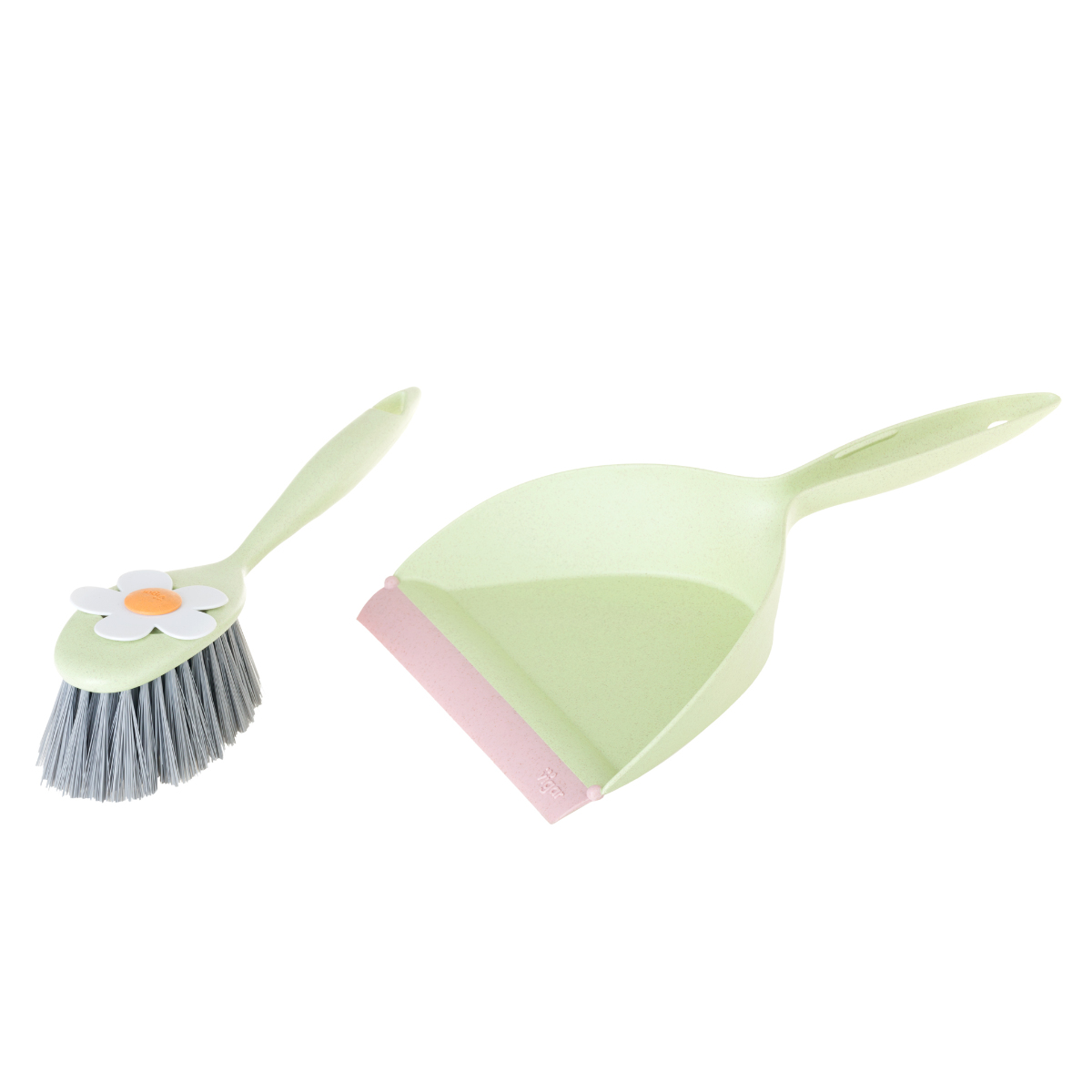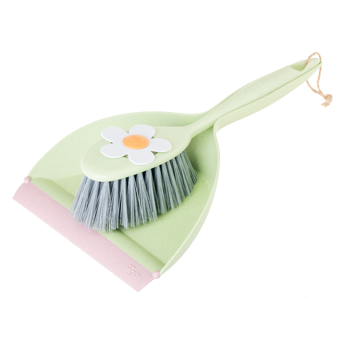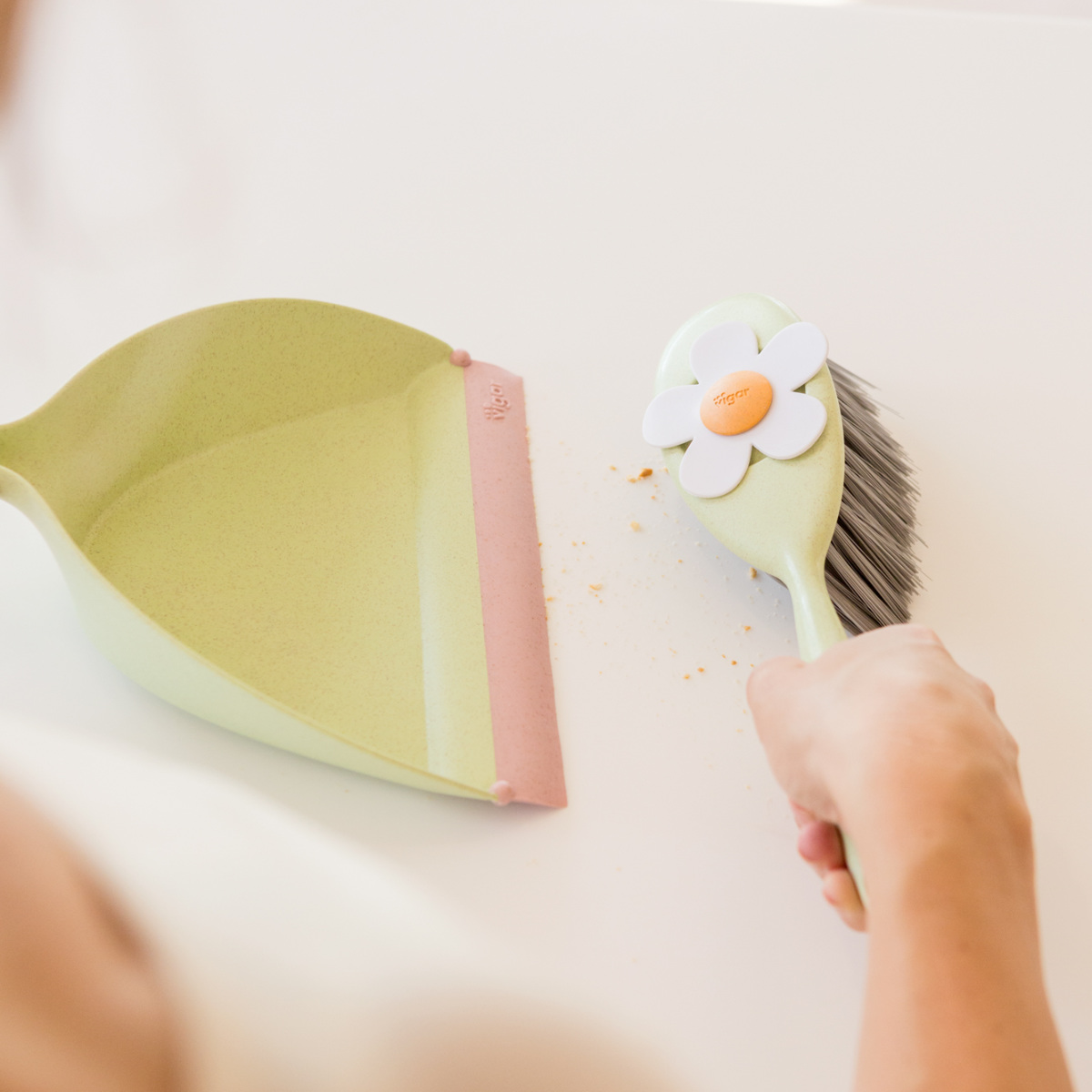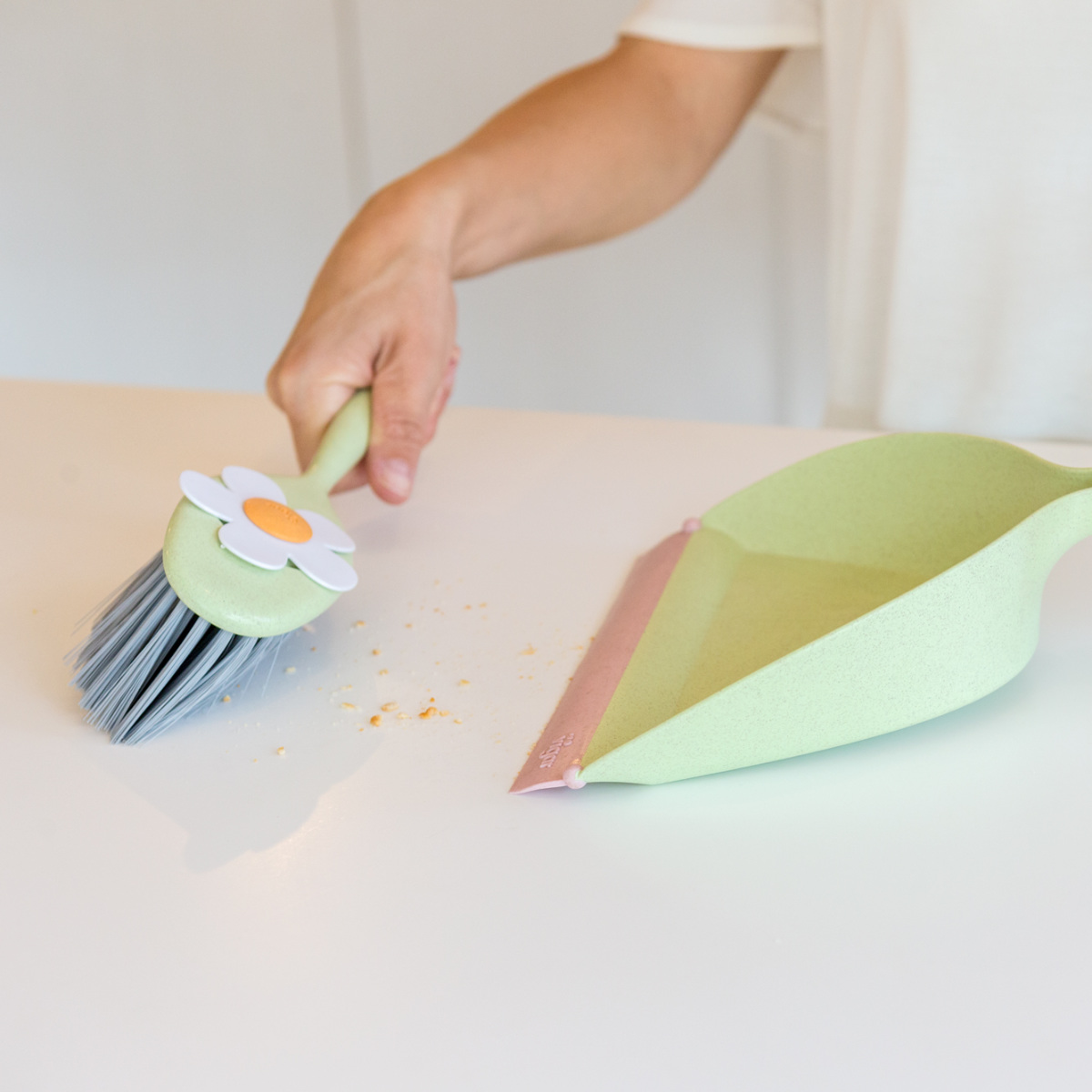 可愛いお花が付いたほうきとちりとりのセットです。デスクやテーブル上の掃除に最適なサイズで、パンくずや消しカスをサッと片づけられます。