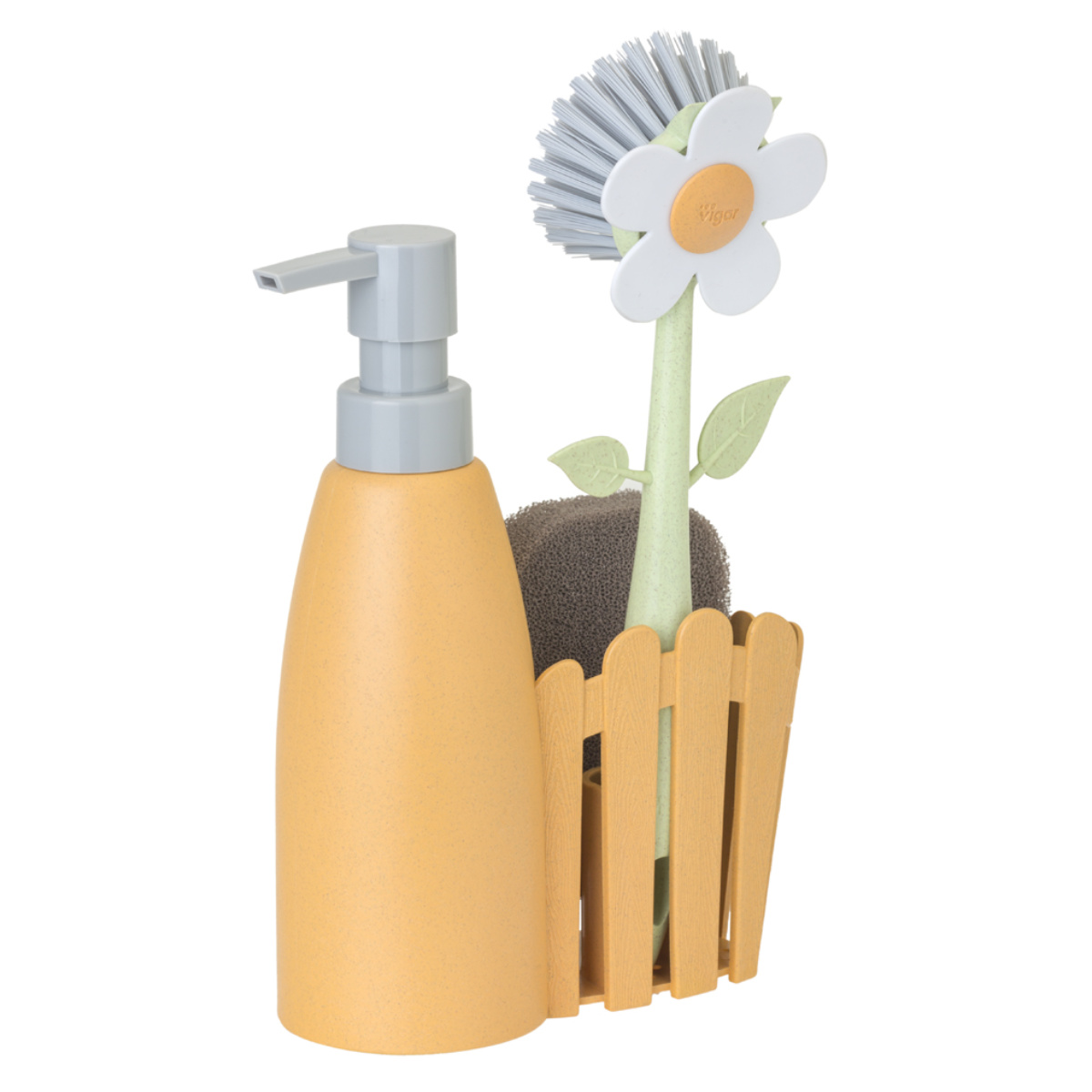 容量340mlのソープディスペンサー付きスポンジラック、ディッシュブラシ、スポンジの3点セットです。シンク周りに必要なアイテムが一つにまとまっているので、場所を取らず使いやすいです。スポンジラックは隙間が空いているので、スポンジやブラシが乾きやすくなっています。