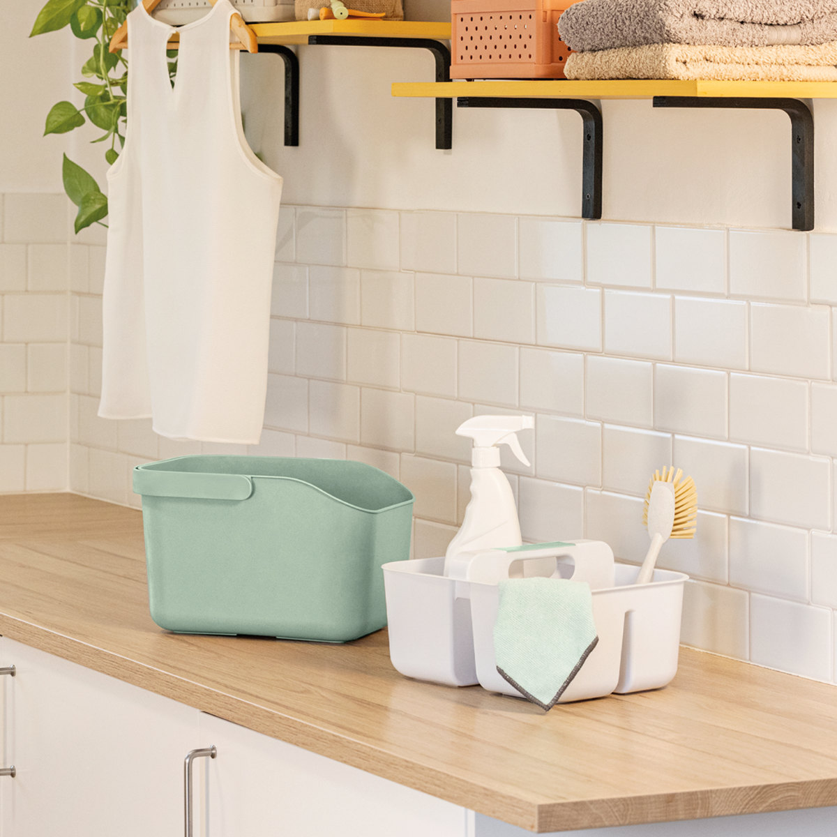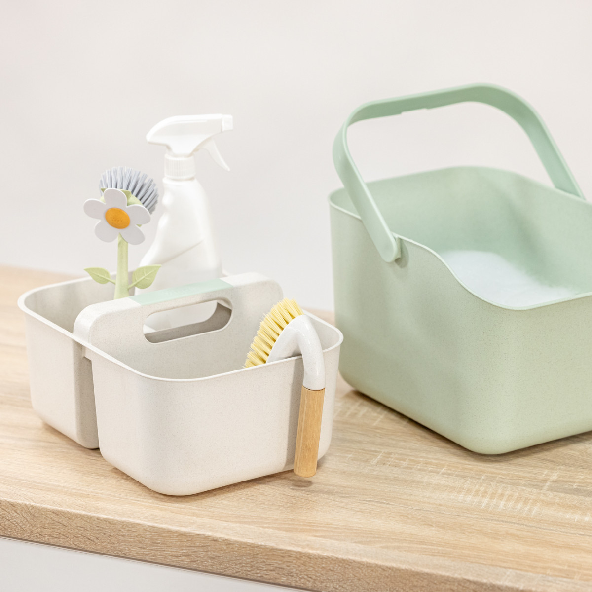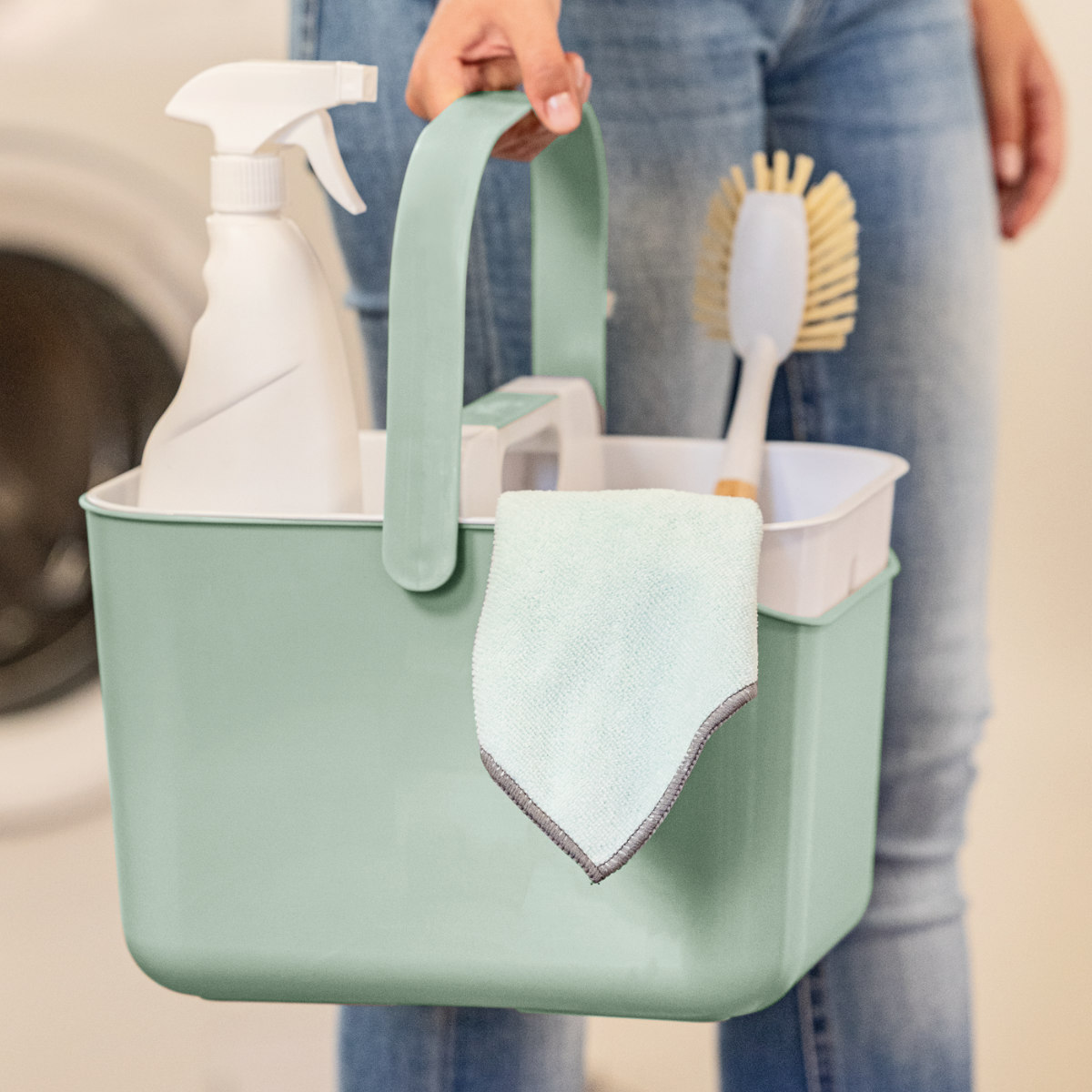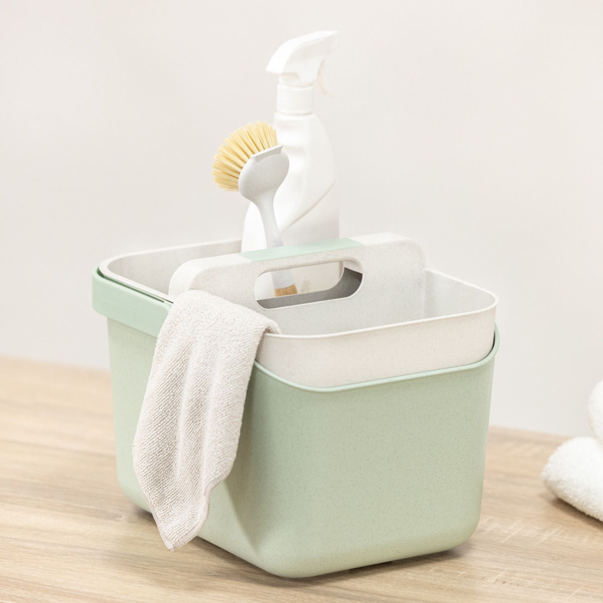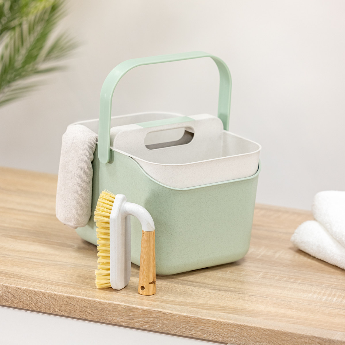 バケツと用具入れが一緒になったバケツ&キャディセットです。バケツ一つ分のスペースがあればすべて収まるため、省スペースで便利にお使いいただけます。一緒に持ち運ぶことで効率よく手軽にお掃除することができます。