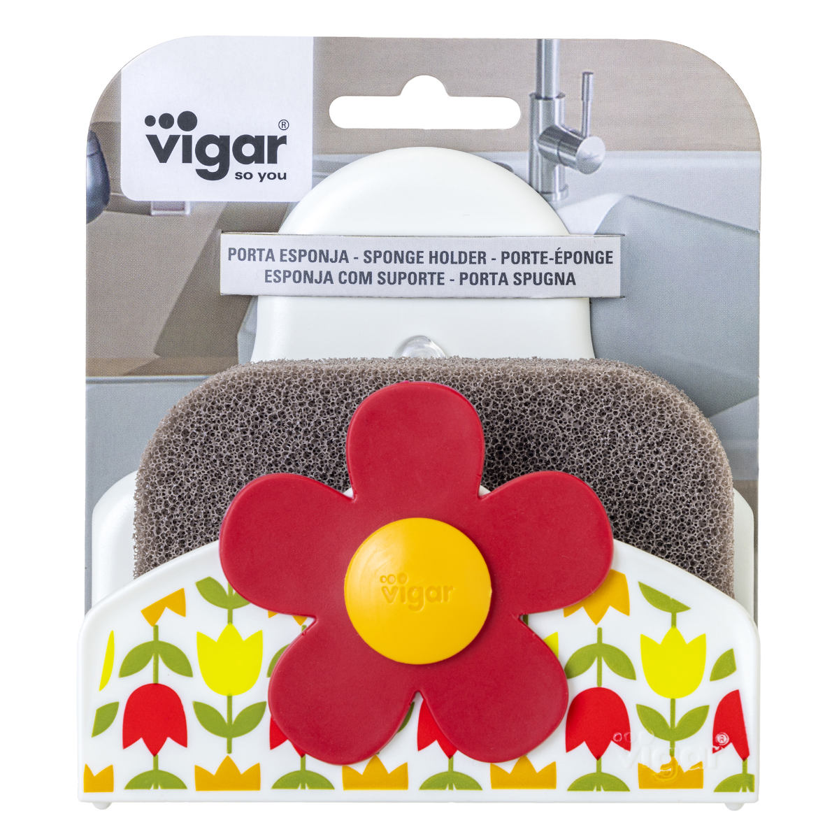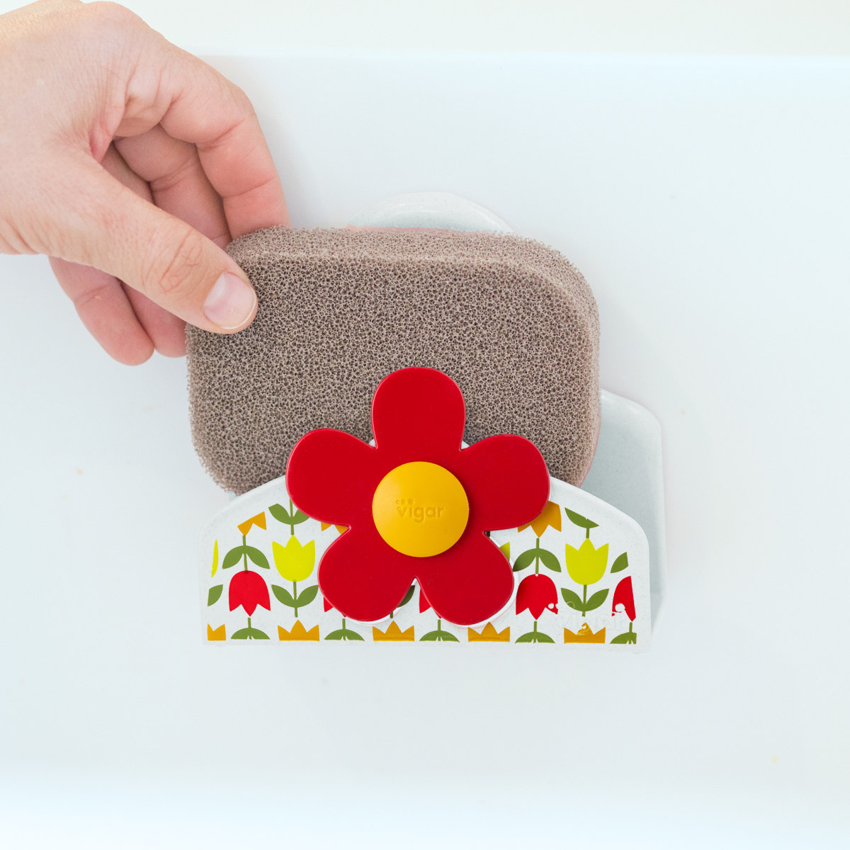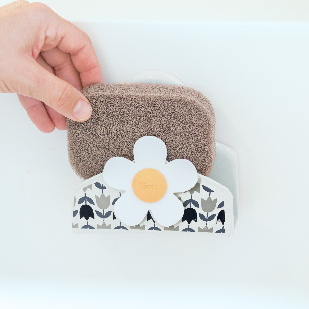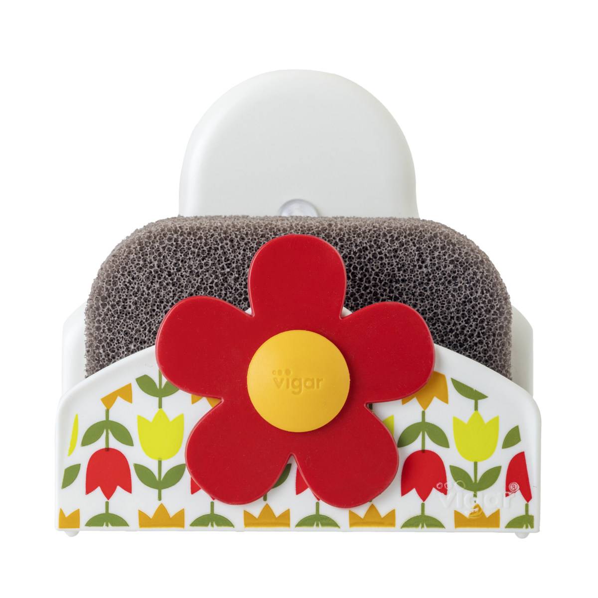 スポンジを乾かしながら置いておけるスポンジホルダーです。ホルダー部分はチューリップのデザインで、真ん中にはお花のモチーフがあります。キッチンを華やかにしてくれるアイテムです。