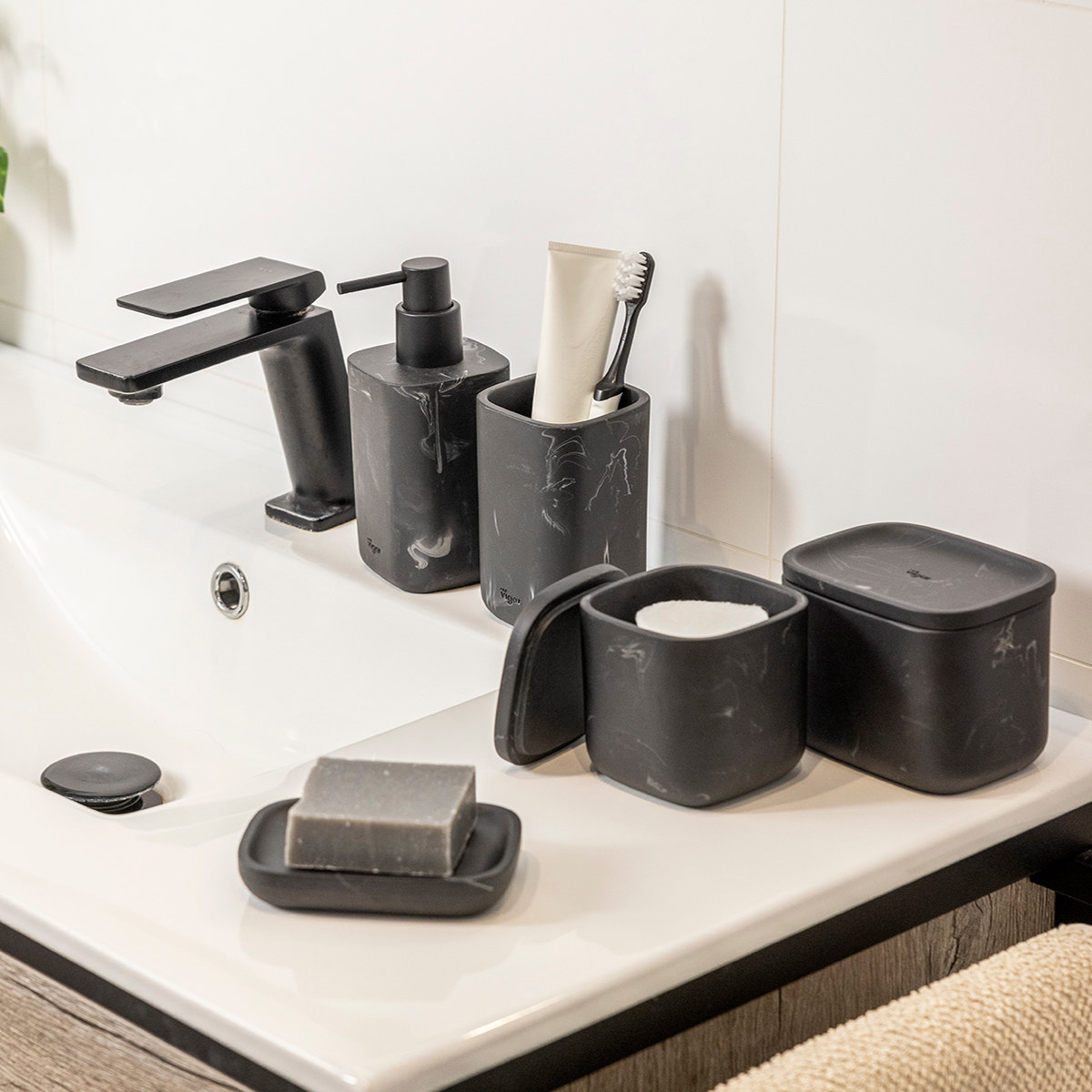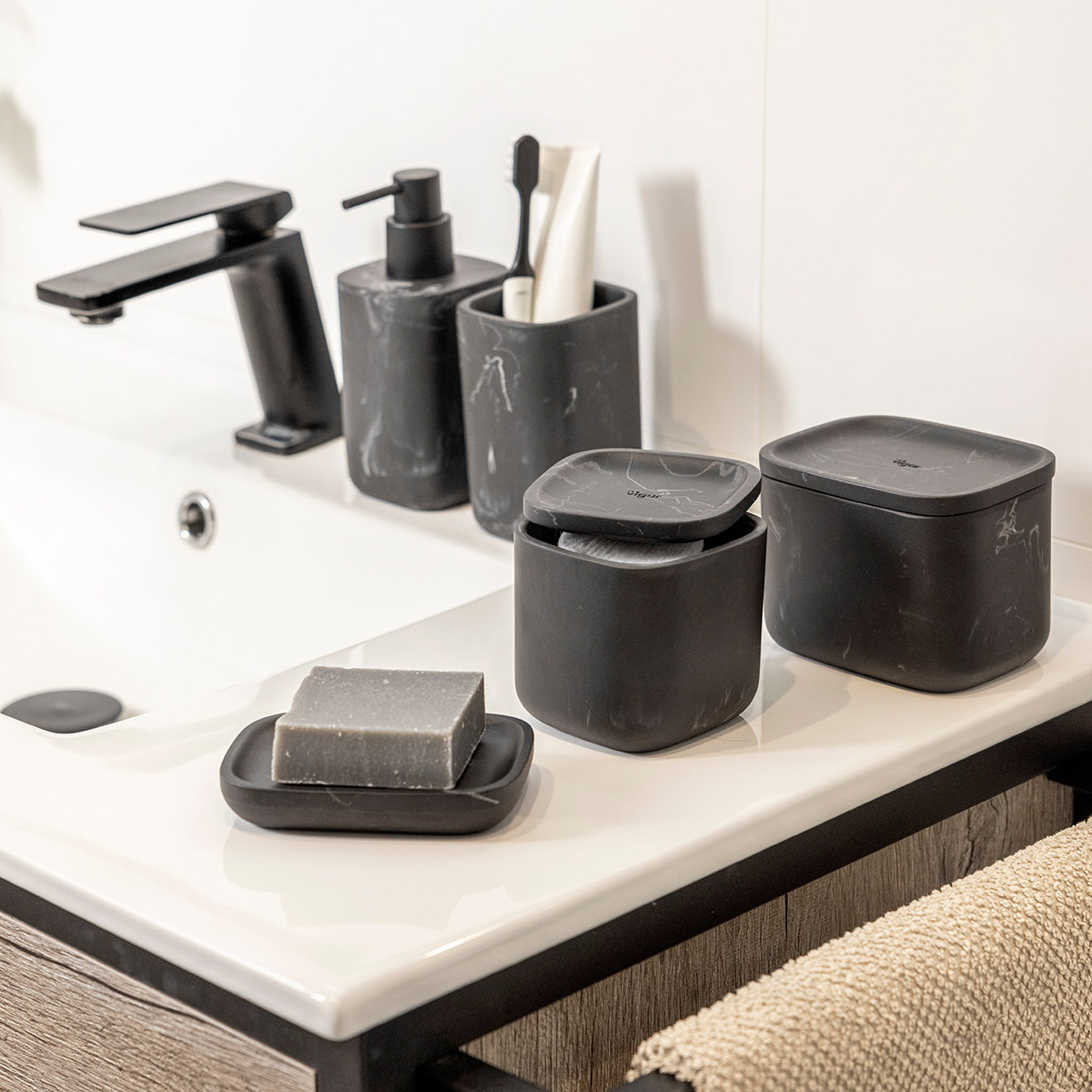 陶器のような見た目で、スタイリッシュなデザインの「ZENSE」の洗面用品シリーズ。収納ケースやソープトレイ・歯ブラシホルダーなど、シリーズで揃えることで統一感のある落ち着いた空間に演出できます。