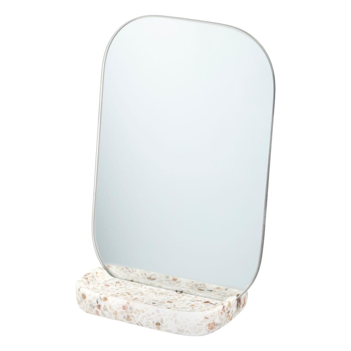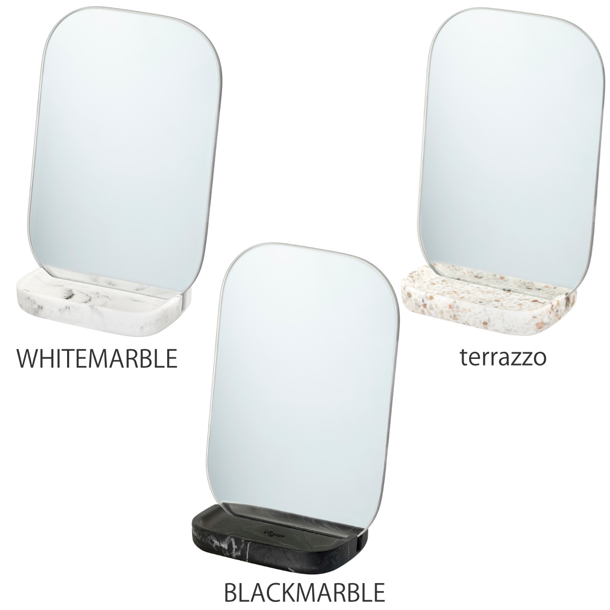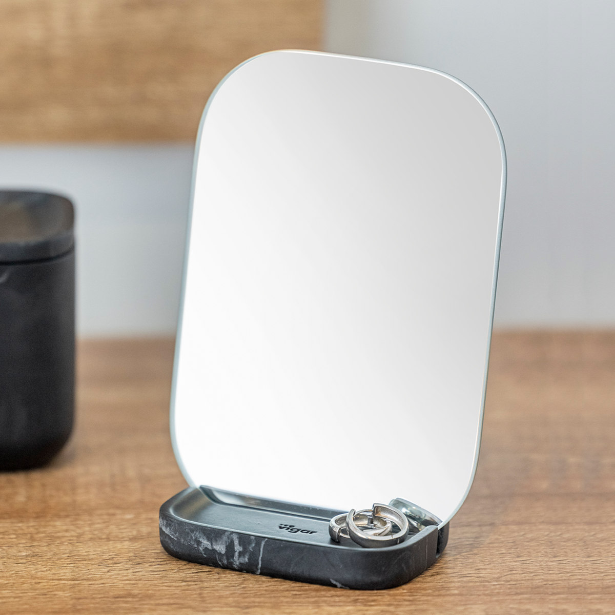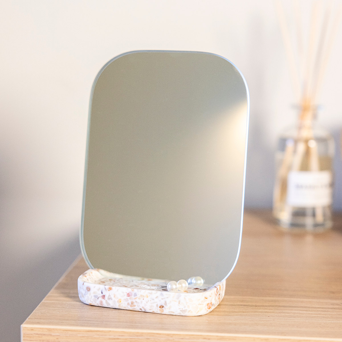 洗練されたデザインと実用性を兼ね備えた卓上ミラーです。メイクで使いやすいコンパクトなサイズで、長方形のミラーが顔全体を映します。ミラーは取り外し可能で、近くで見たい時は手鏡のように手に持って使えます。