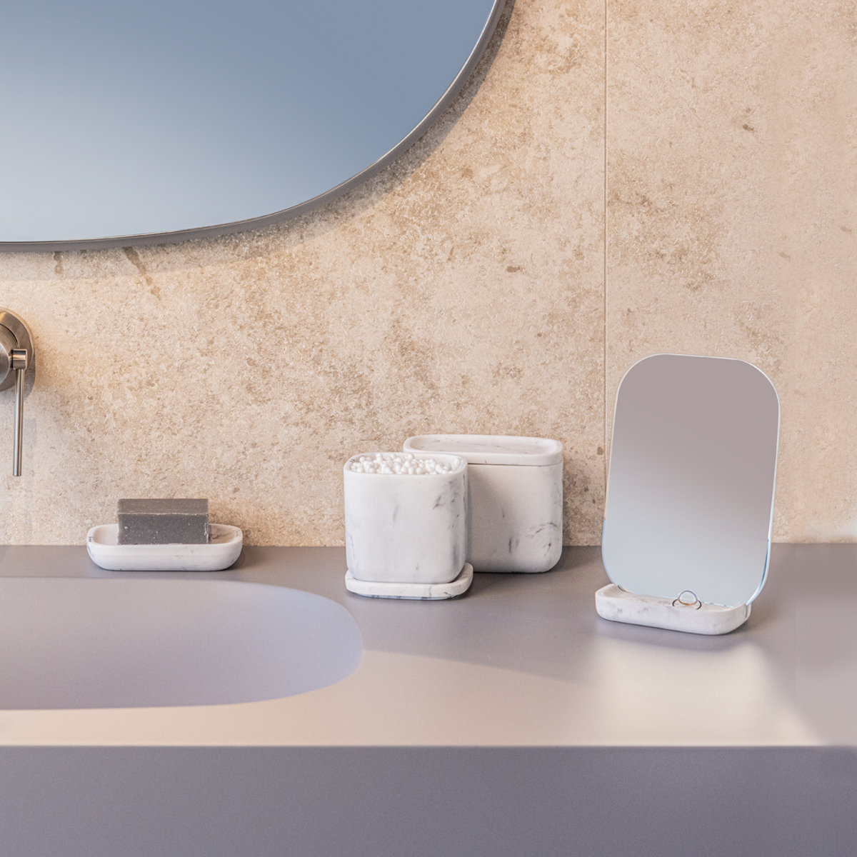 台座は、割れにくく耐久性に優れたポリレジン素材です。水や湿気に強く、水まわりでも安心して使えて、日々のお手入れも簡単です。