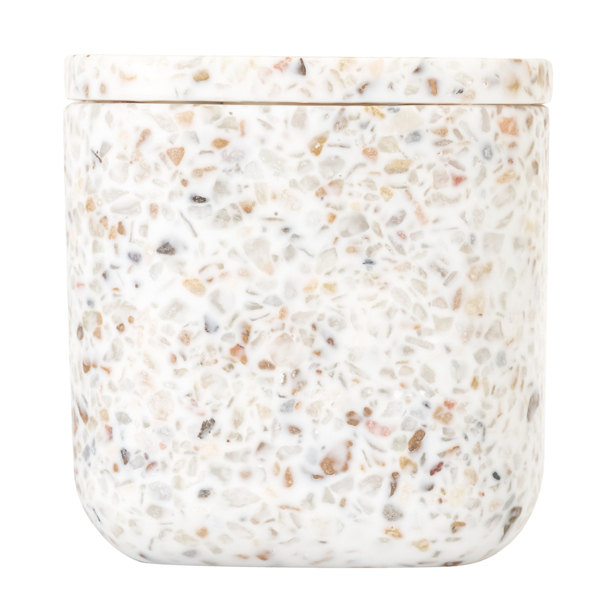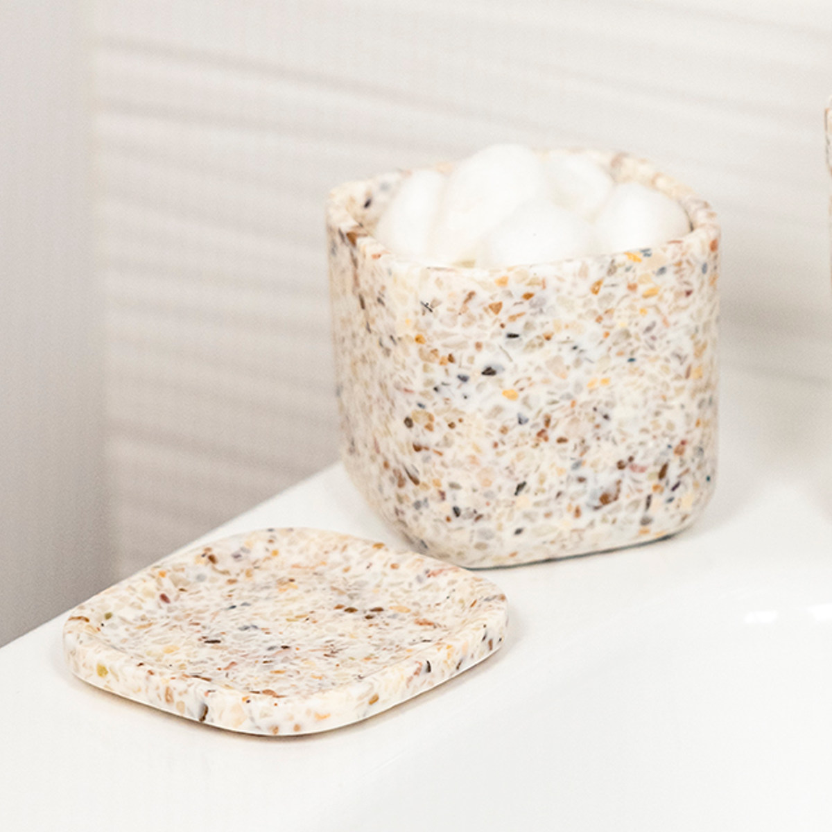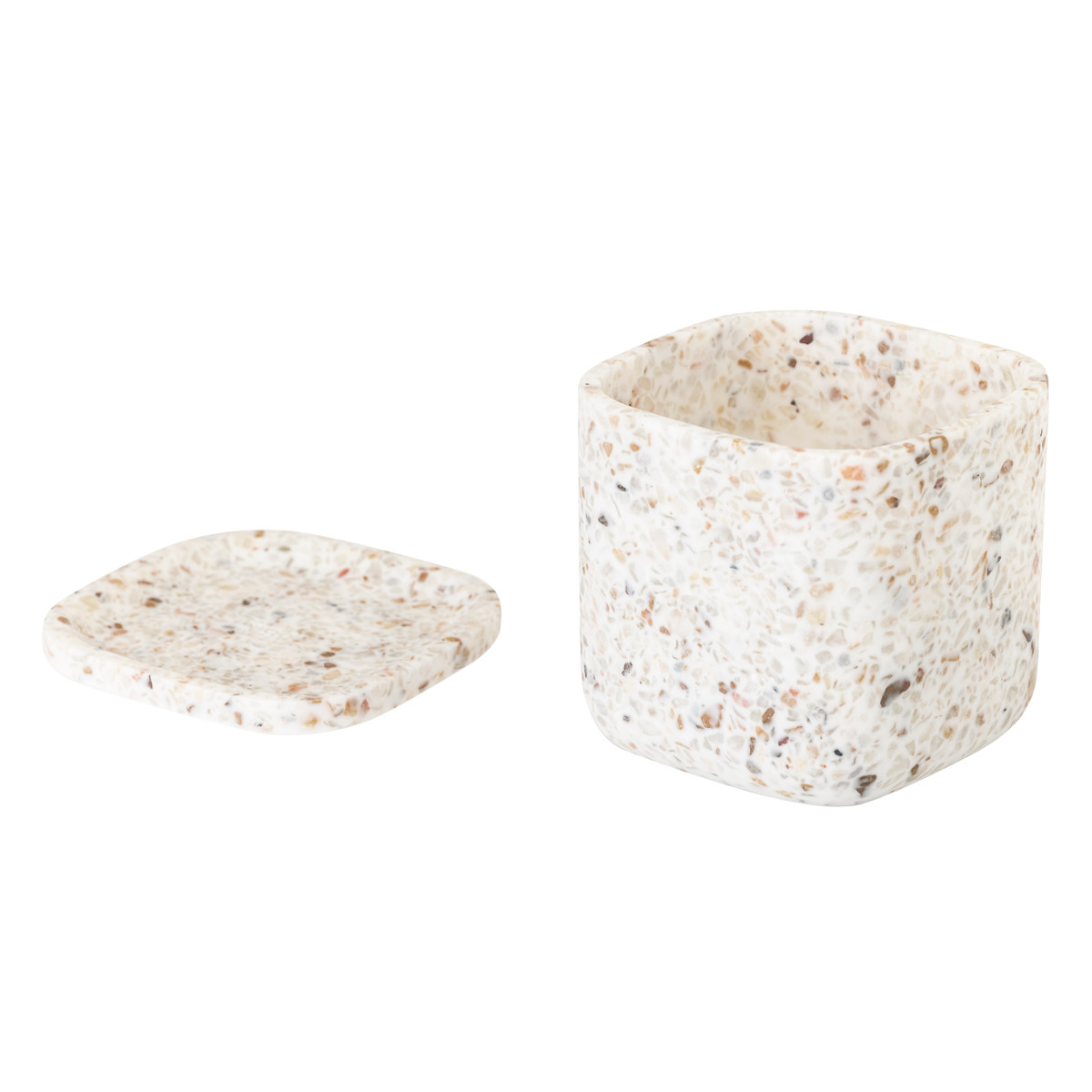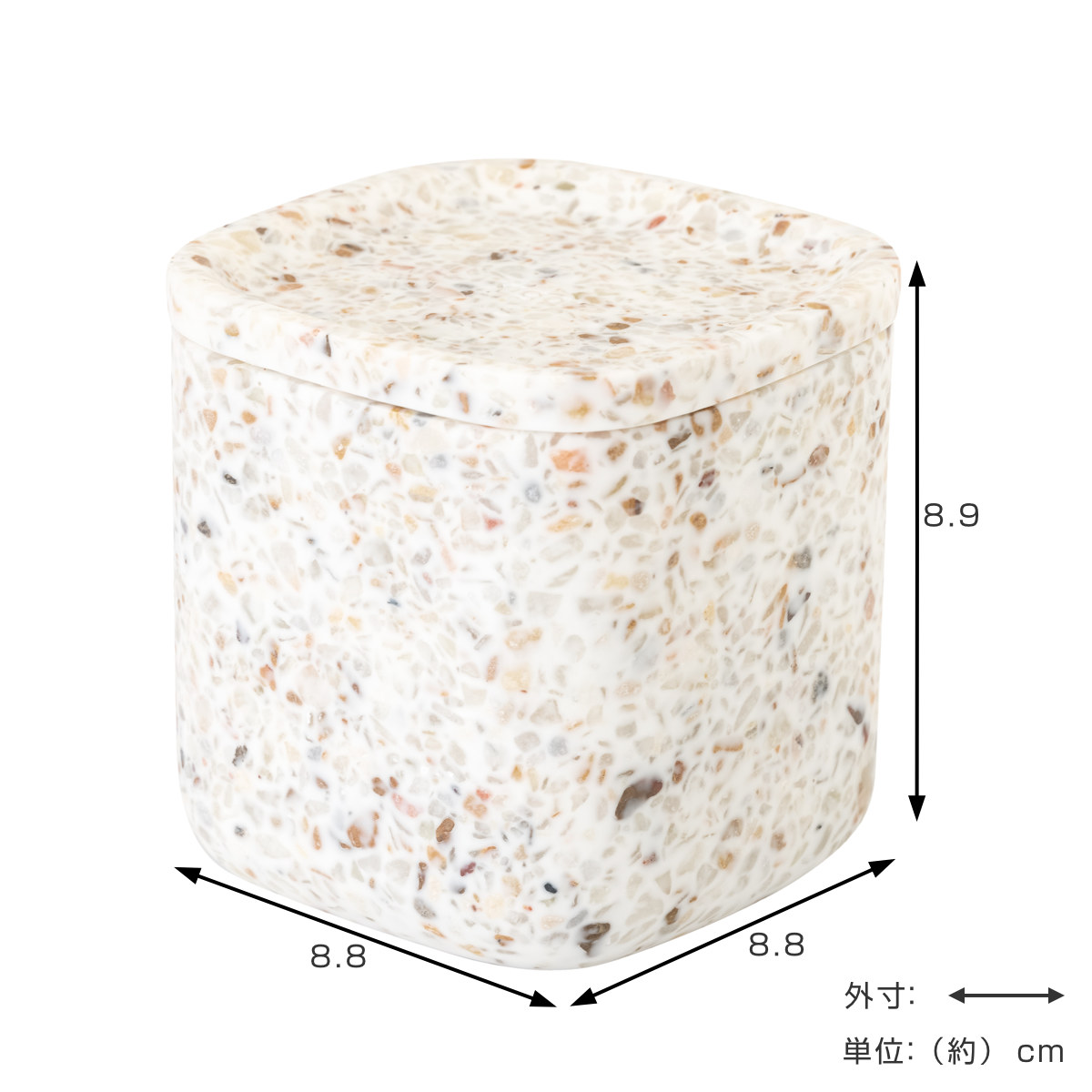 陶器に比べて割れにくく、耐久性に優れたポリレジン素材です。水や湿気に強いので、洗面所やトイレなど水周りの収納として最適です。