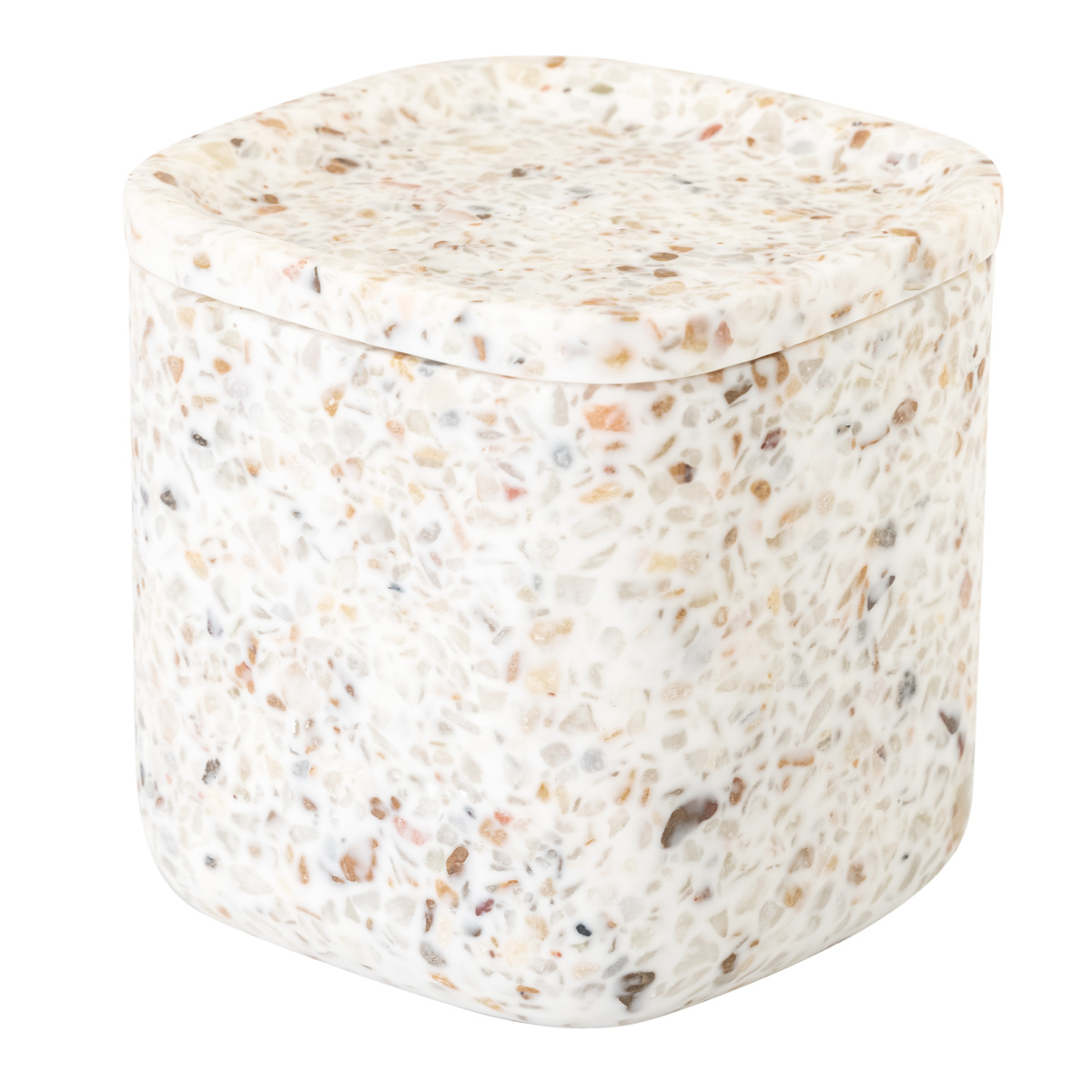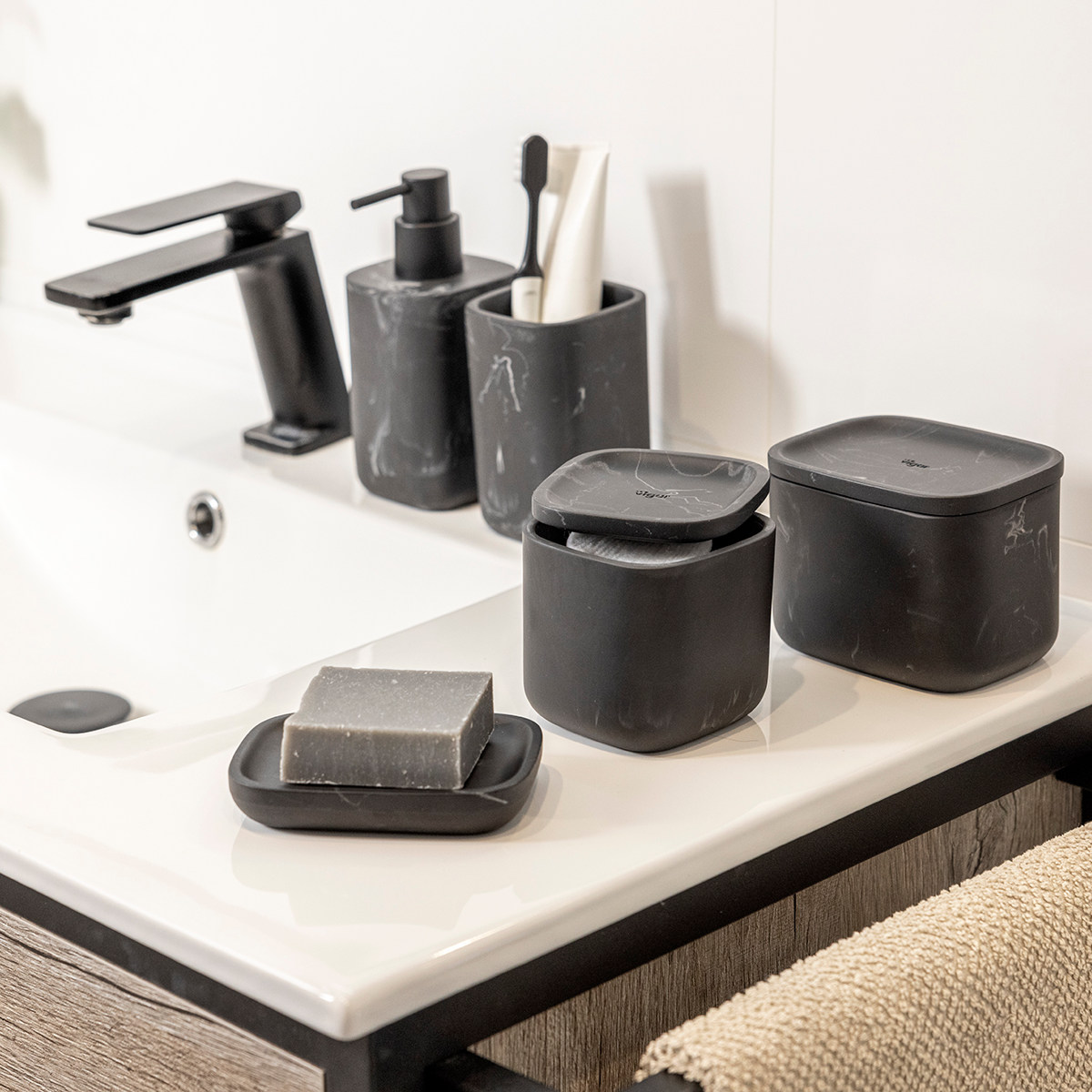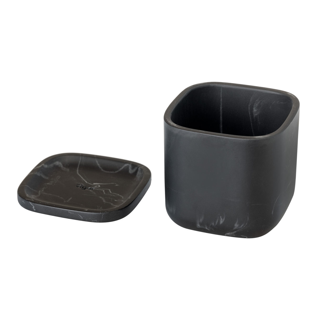 陶器のように落ち着いた、マットな質感の小物ケースです。洗面スペースで使うコットンや綿棒などの小物を、生活感を出さずにすっきりと収納できます。重厚感のある佇まいで、ワンランク上の空間に仕上げます。