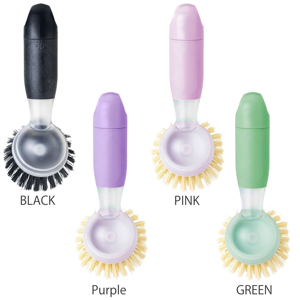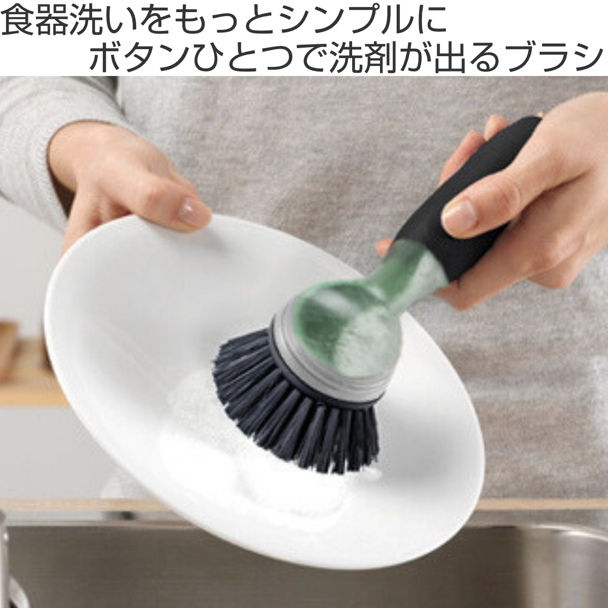 ボタン押すだけで洗剤が出るソープディスペンサー付きのディッシュブラシです。洗剤ボトルに持ち変える手間がなくなるので効率的かつ快適に食器洗いができます。お仕事や育児などで忙しく、家事を時短したい方におすすめです。