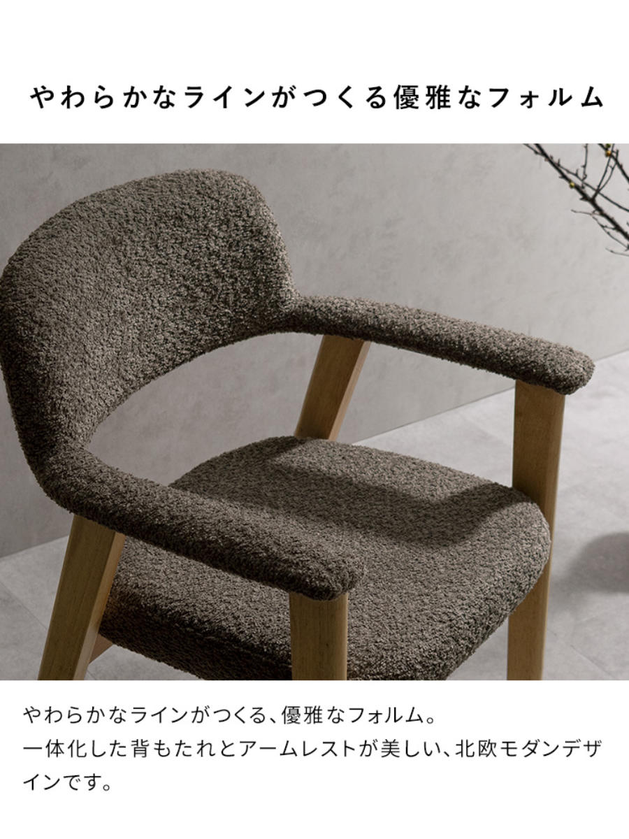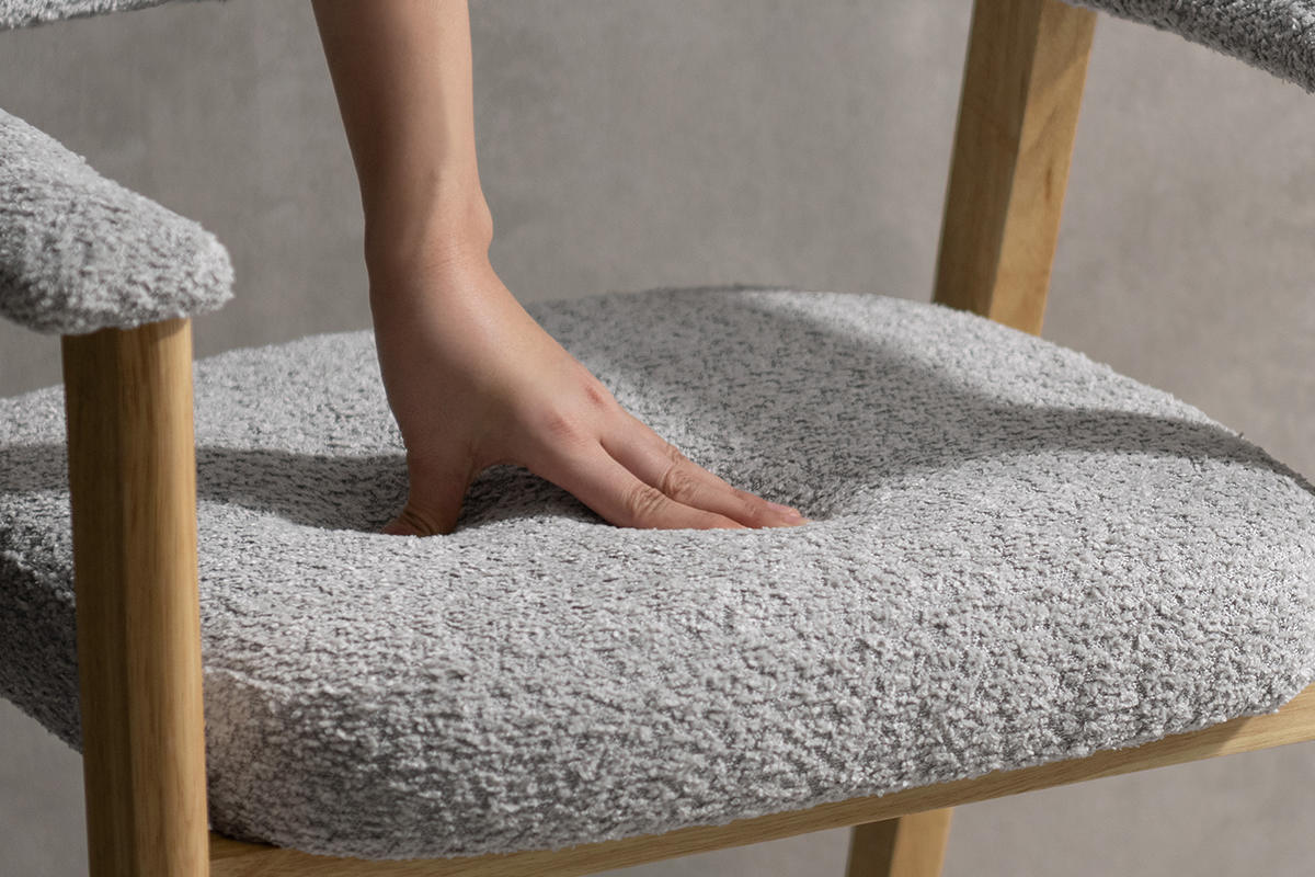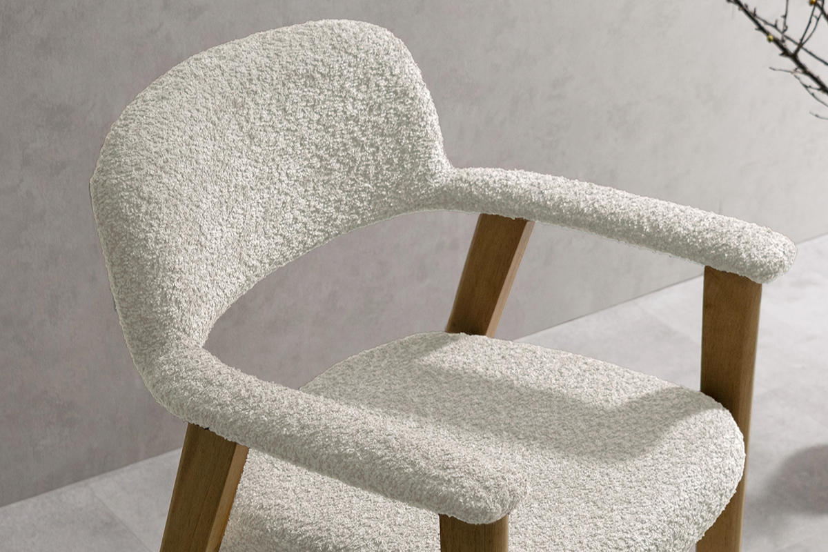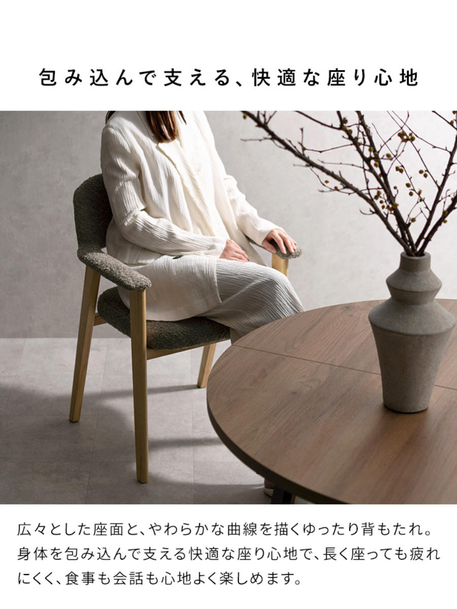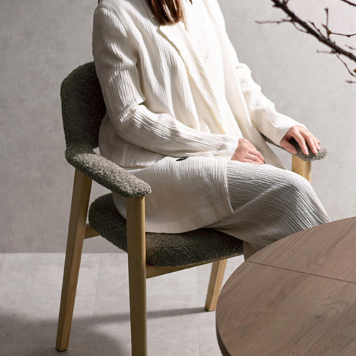 温かみのある天然木フレームと、光の角度で豊かな表情を見せるブークレ生地が、上質な空間を演出します。日常の食卓を、より優雅で心地よいひとときへと導きます。