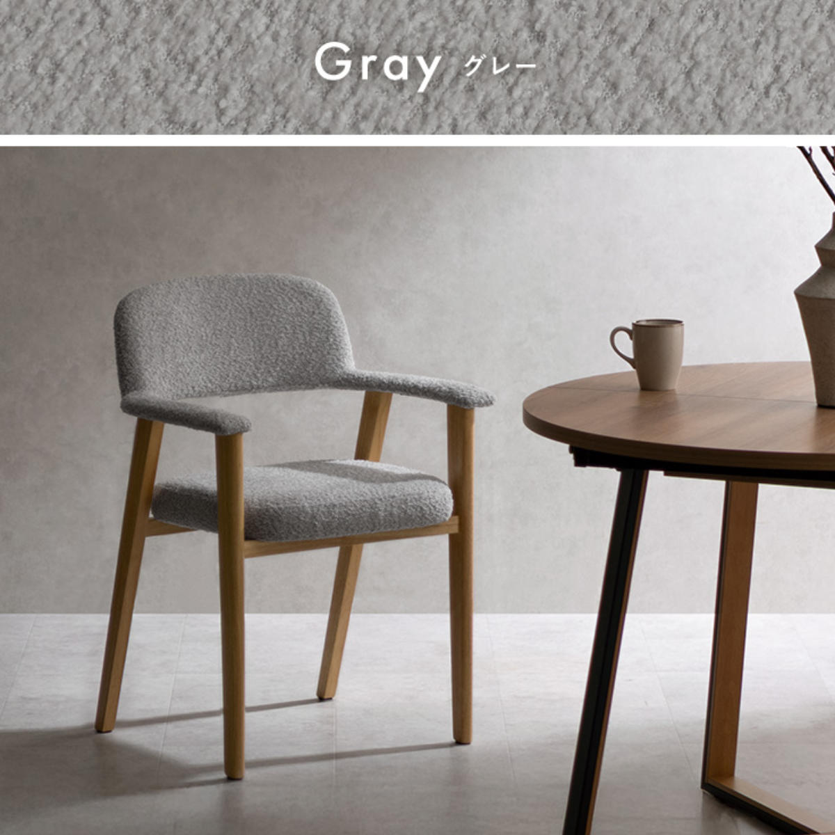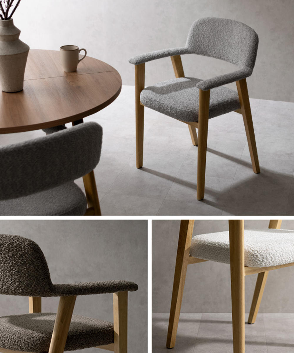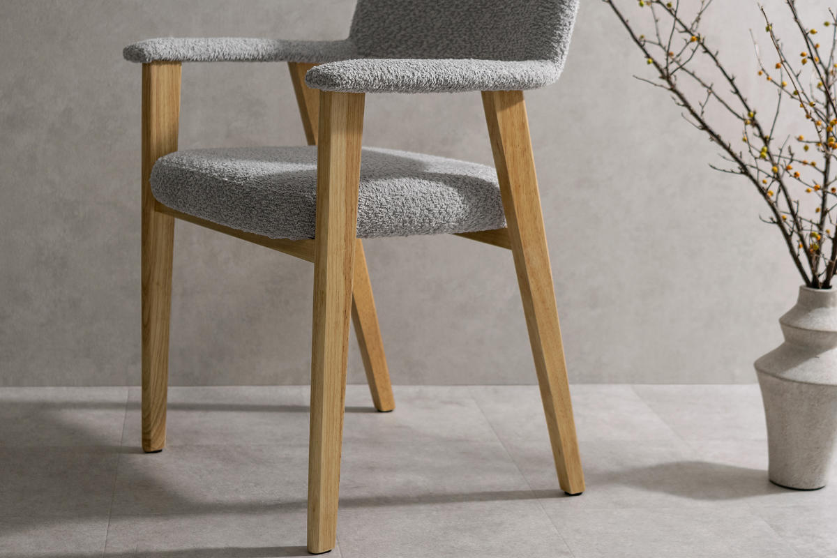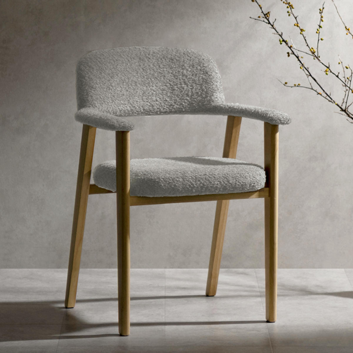 温かみのある天然木フレームと、光の角度で豊かな表情を見せるブークレ生地が、上質な空間を演出します。日常の食卓を、より優雅で心地よいひとときへと導きます。