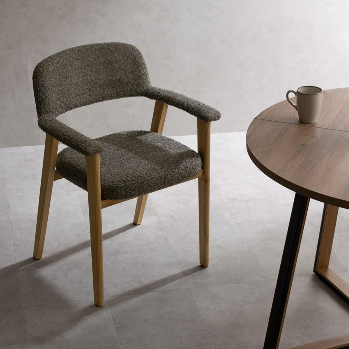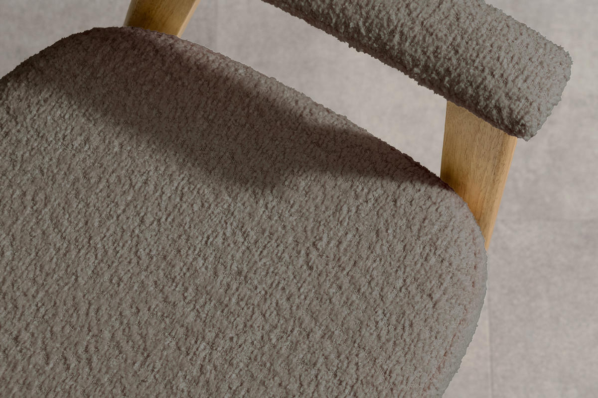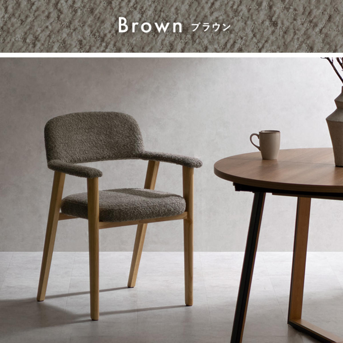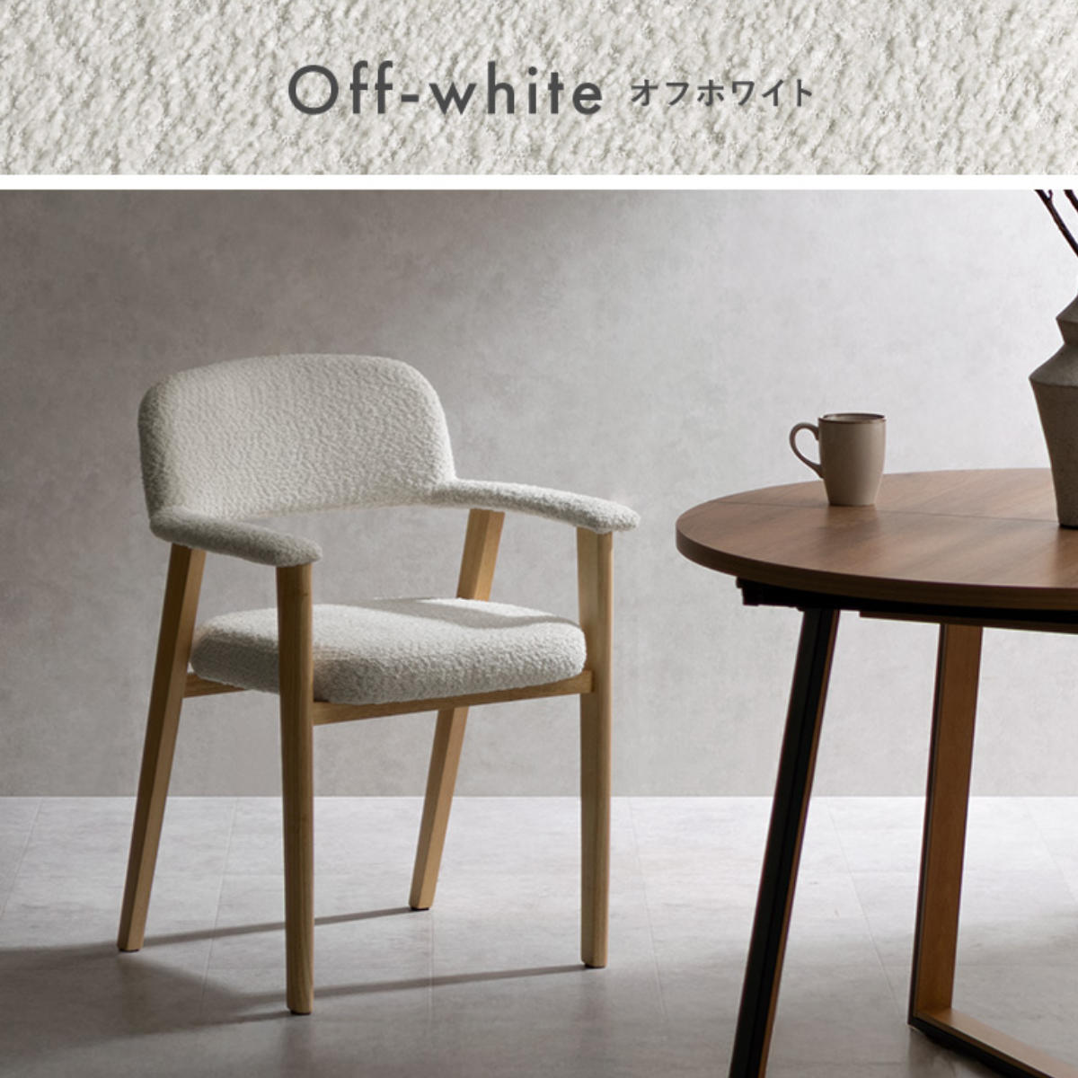 温かみのある天然木フレームと、光の角度で豊かな表情を見せるブークレ生地が、上質な空間を演出します。日常の食卓を、より優雅で心地よいひとときへと導きます。