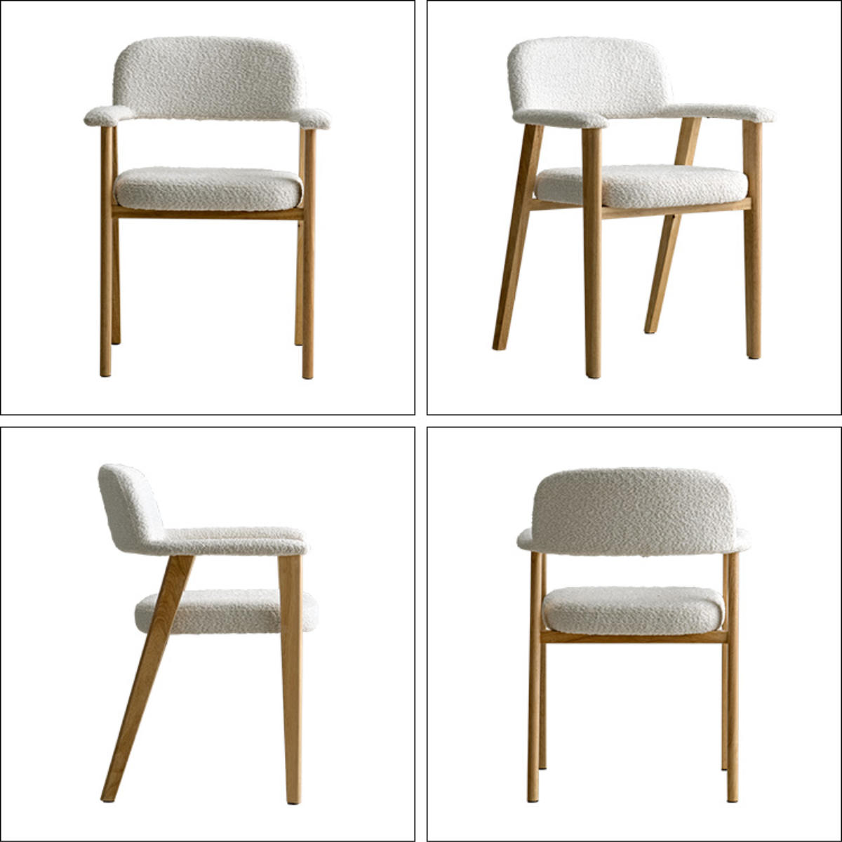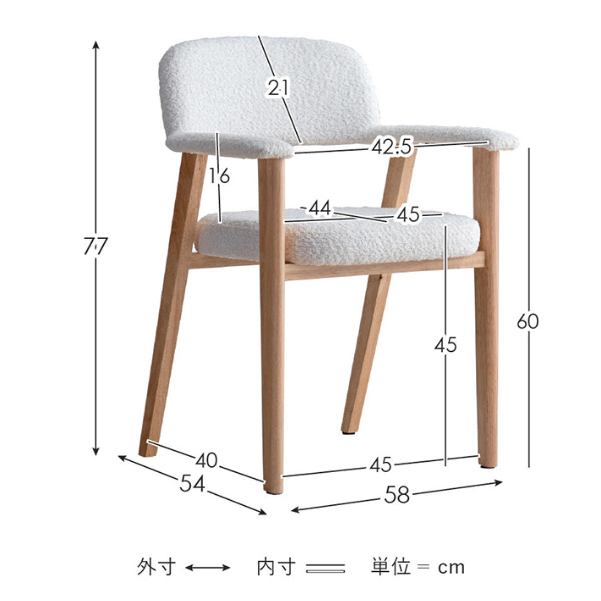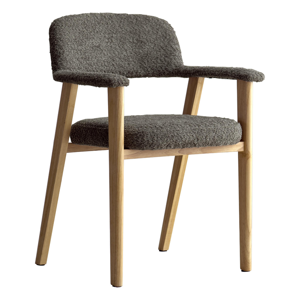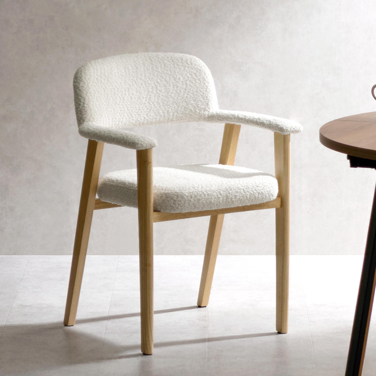 温かみのある天然木フレームと、光の角度で豊かな表情を見せるブークレ生地が、上質な空間を演出します。日常の食卓を、より優雅で心地よいひとときへと導きます。