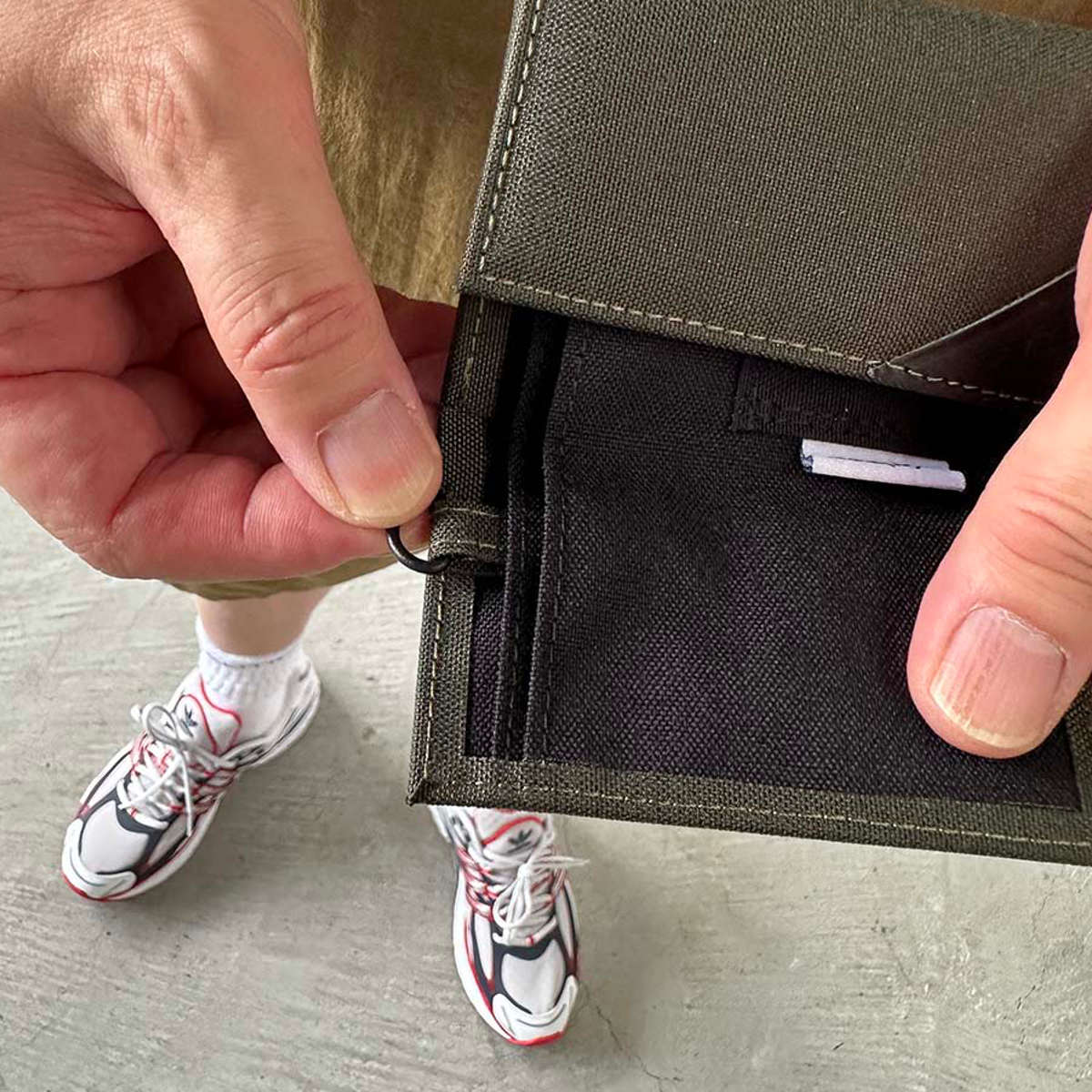 2つに仕切られていて、紙幣と領収書、チケットなどを分けて収納できます。カードは2枚分のスリットが付いています。また、D型管が付いているので、紐やチェーン、カラビナなどでバッグのハンドルに付けたり、なくさないように工夫できます。