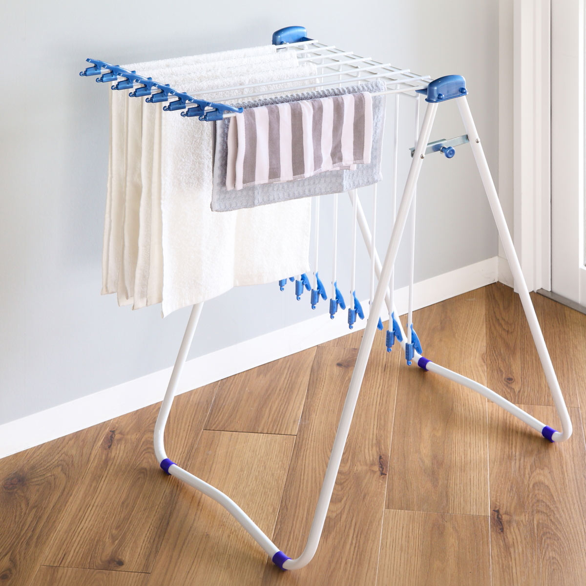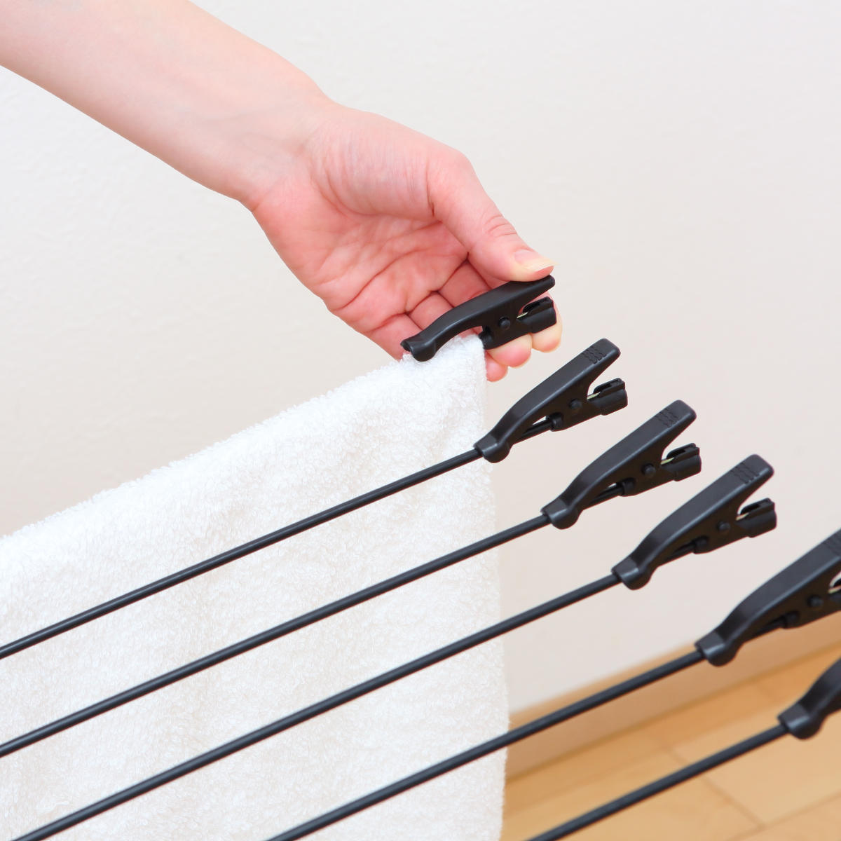タオルと一緒に衣服やハンカチも干せます。クリップでしっかりと止めることができるので、洗濯物がずれ落ちることもありません。