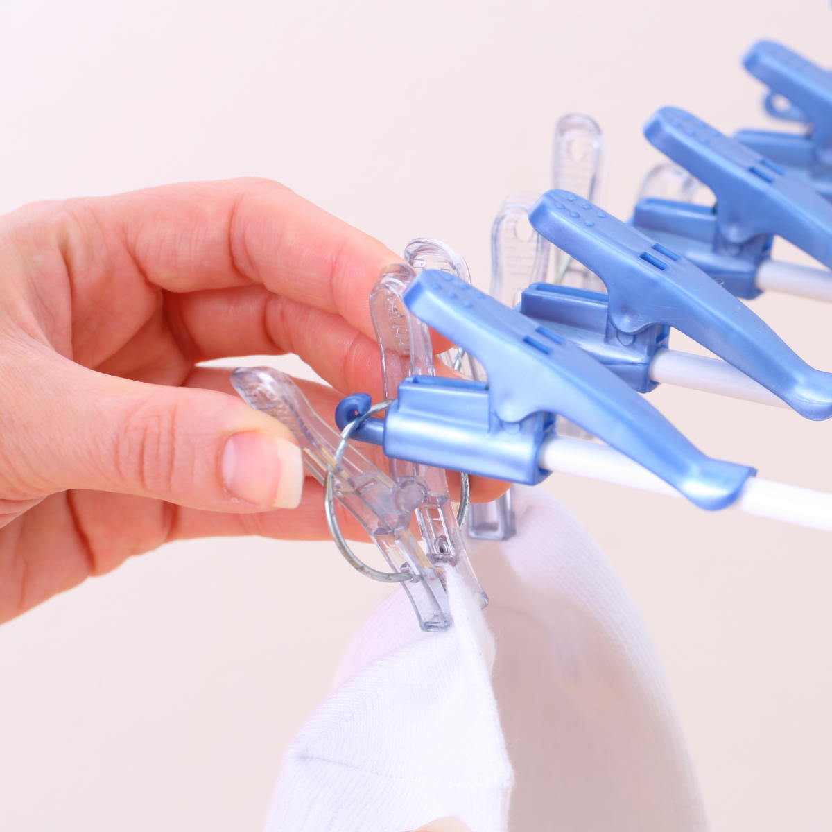 先端にお手持ちのピンチを付けていただくと、靴下や小物を掛けて干すことができます。なんでも干せる万能物干しです。