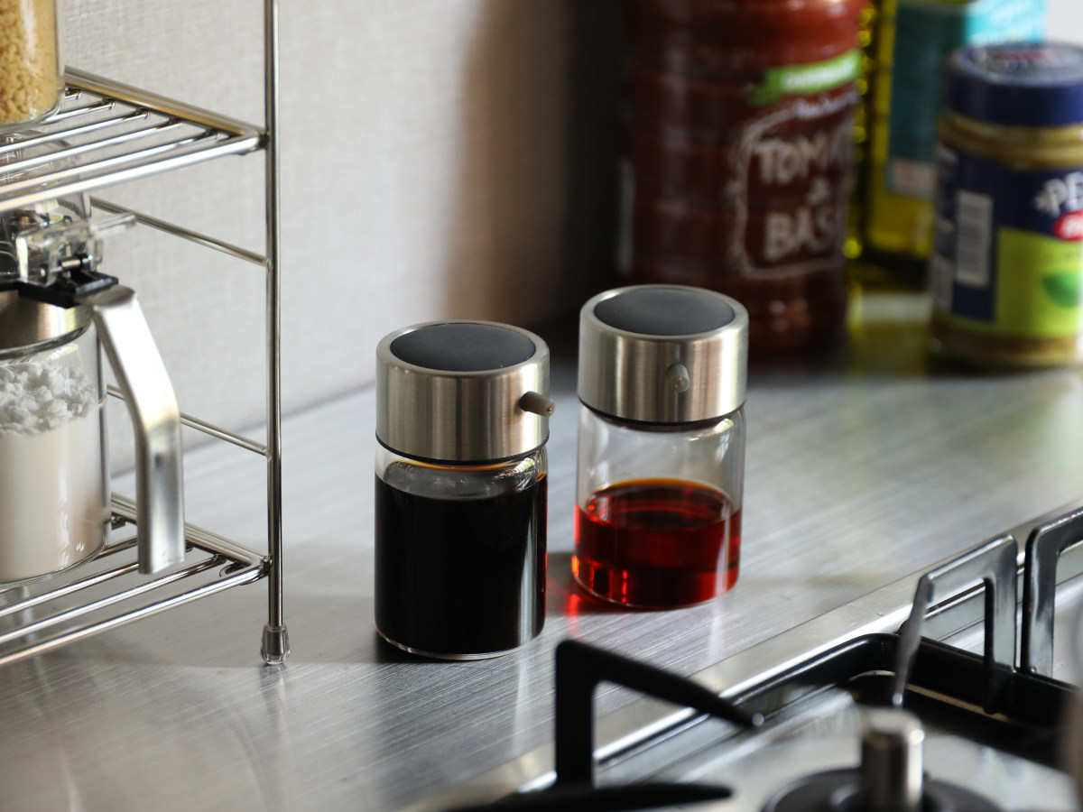 透明なガラス容器なので、醤油の残量や状態がひと目で分かります。色やニオイ移りもしにくく、長く使えます。