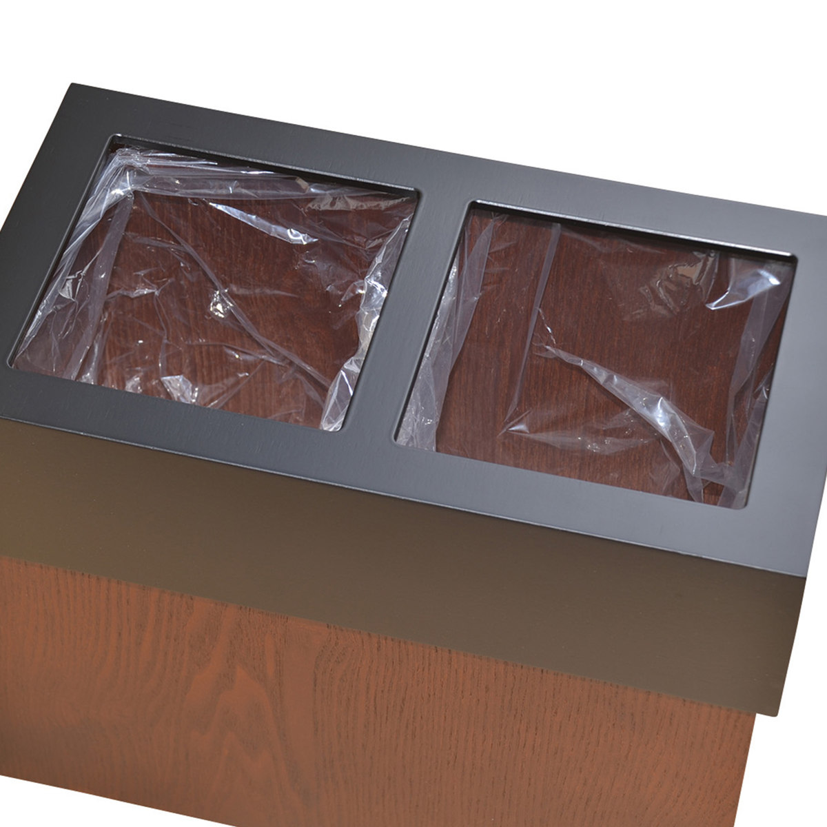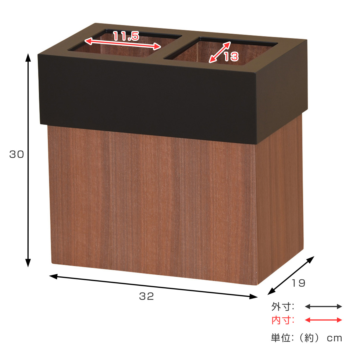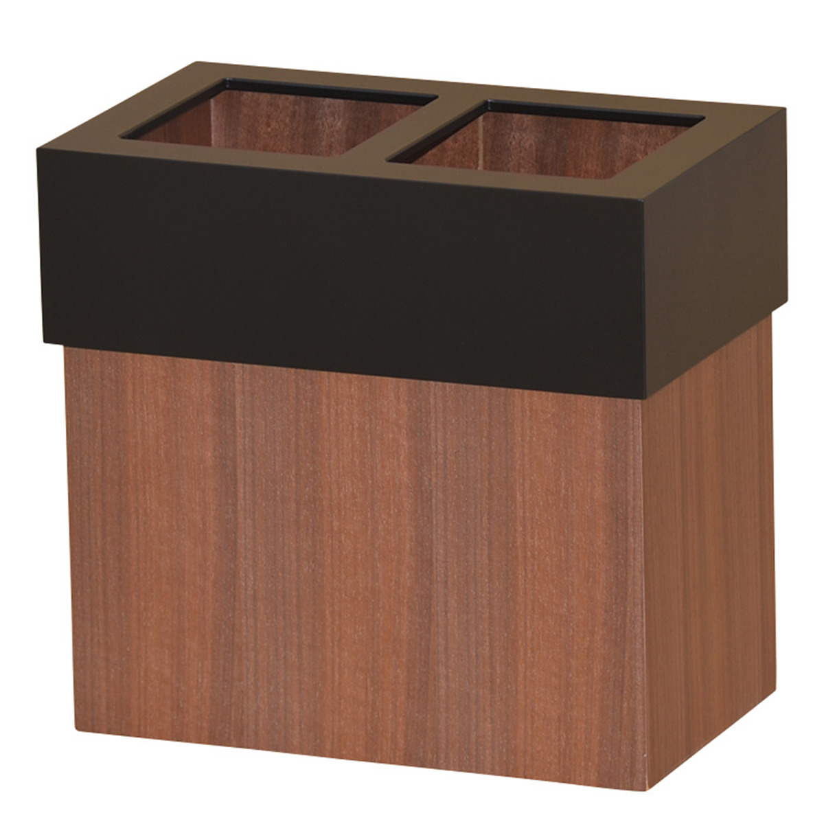 ●分別しやすい2口構造と、ウォールナットの木目を活かした落ち着きあるデザインが魅力のゴミ箱です。