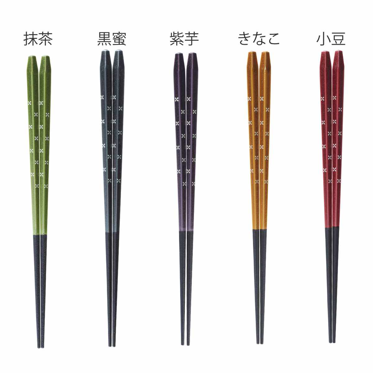 23cmの和風すいーつシリーズのお箸です。抹茶、黒蜜、紫芋、きなこ、小豆からお選び下さい。持ち手が五角になって箸先にはすべり止めが付いており食べ物が滑りにくく、つかみやすいです。