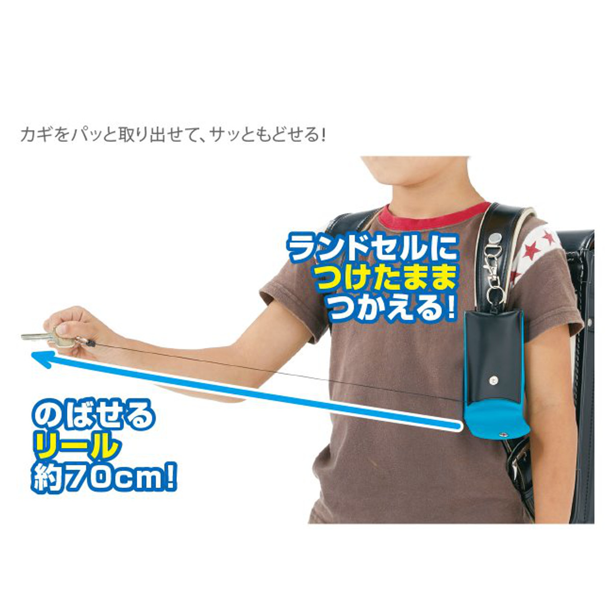 伸ばせるリールは約70cmあり、カギの開け閉めもスムーズ。フックとボタンでランドセルの肩ベルトにしっかり固定できるので安心です。さらに、雨や汚れを簡単に拭き取れる素材を使用しているため、お手入れも簡単です。