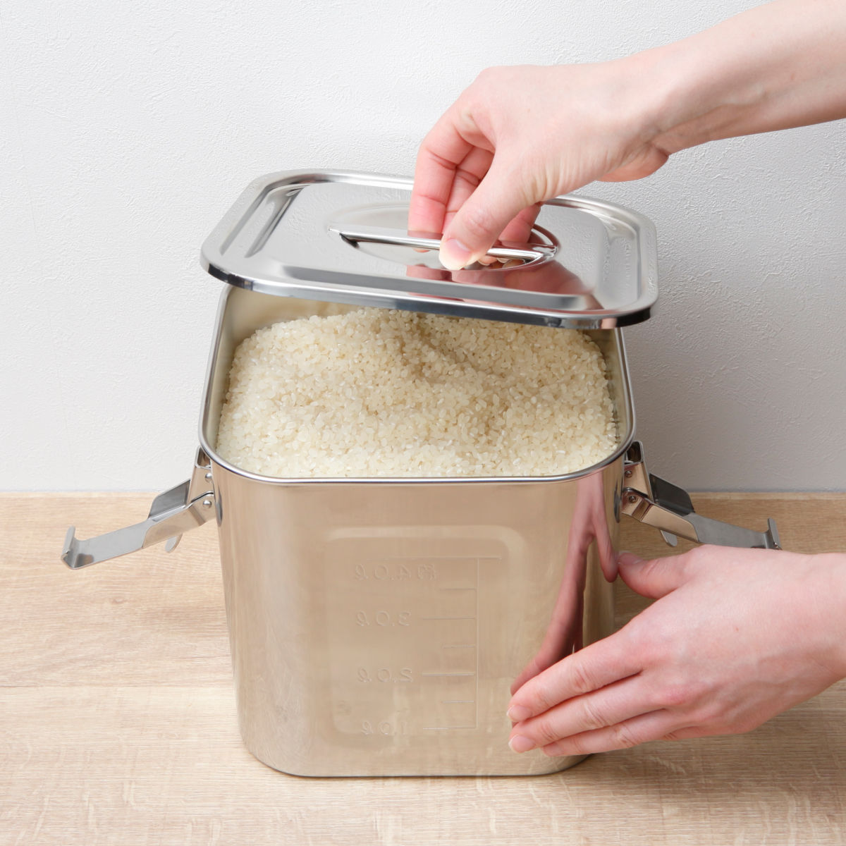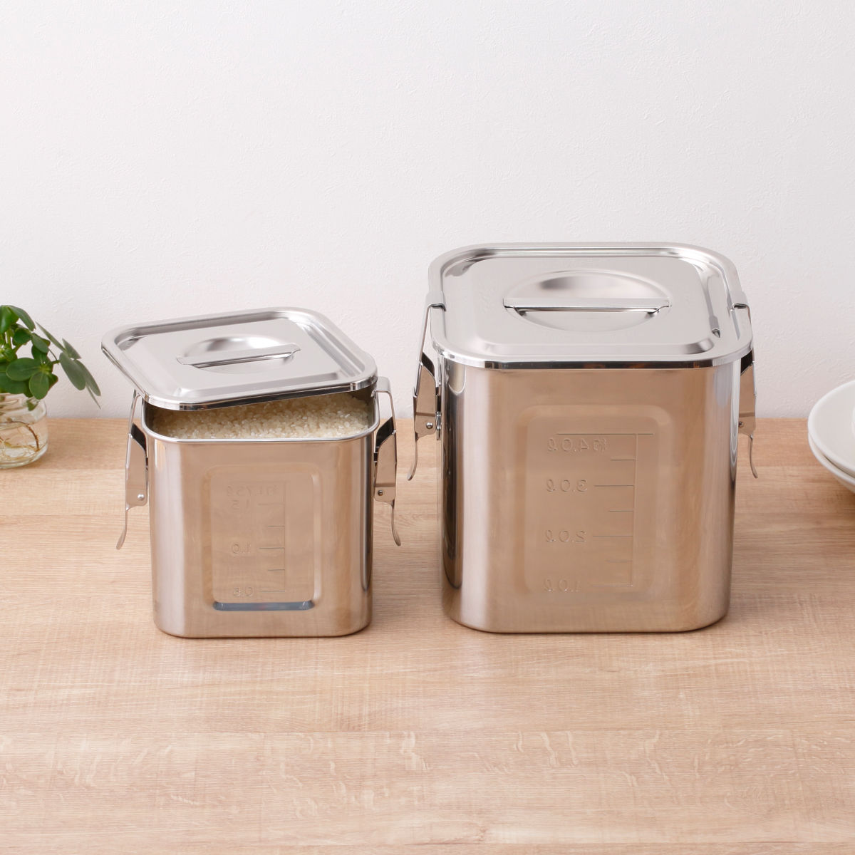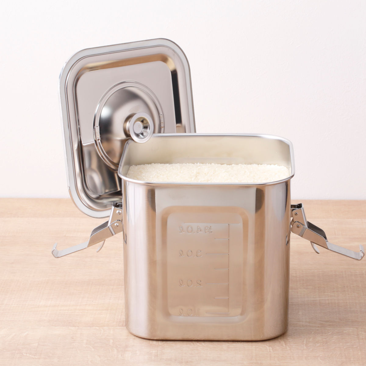 丈夫でサビにくいステンレス製の米びつです。直射日光を防ぎ、約4kgのお米を保存することができます。ステンレス製なので、静電気の影響が少なく、お米が容器にくっつきにくく、最後まで無駄なく使えます。