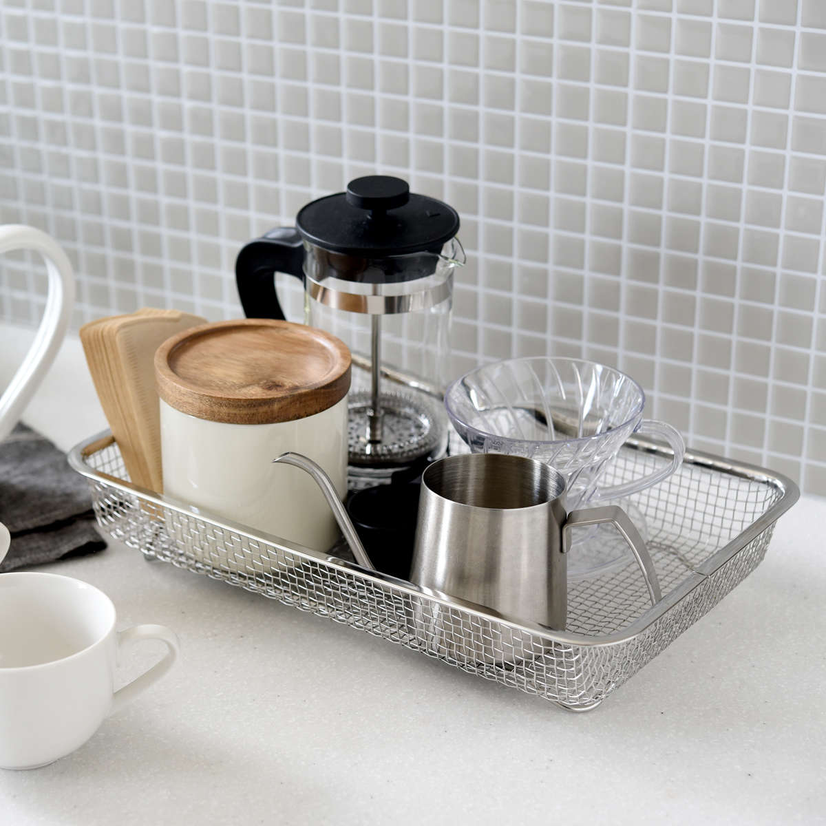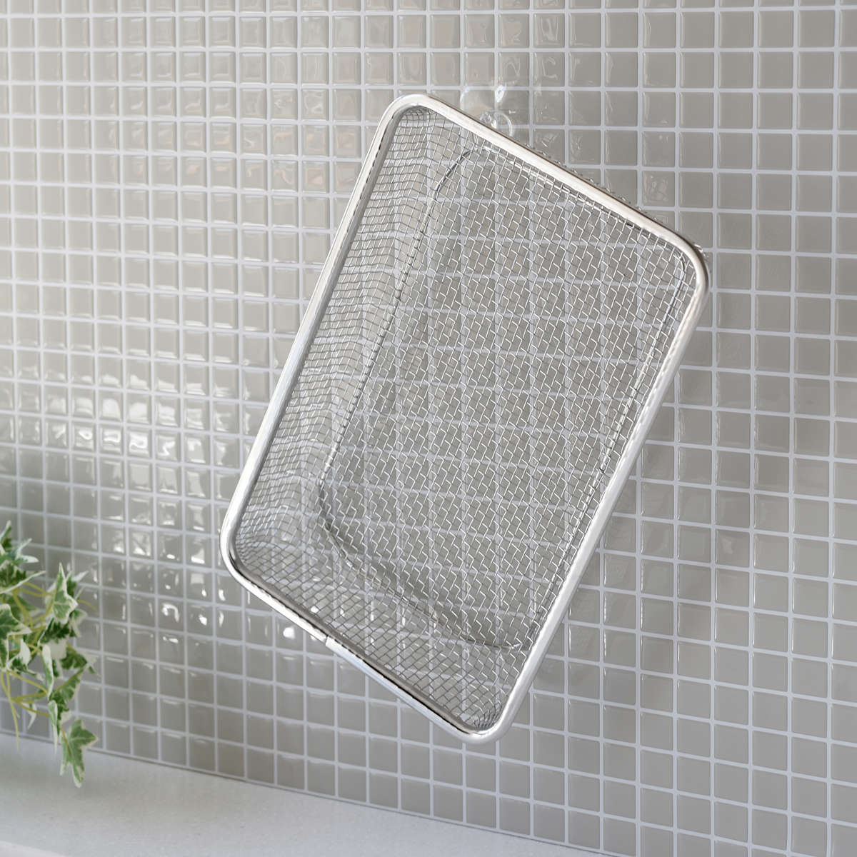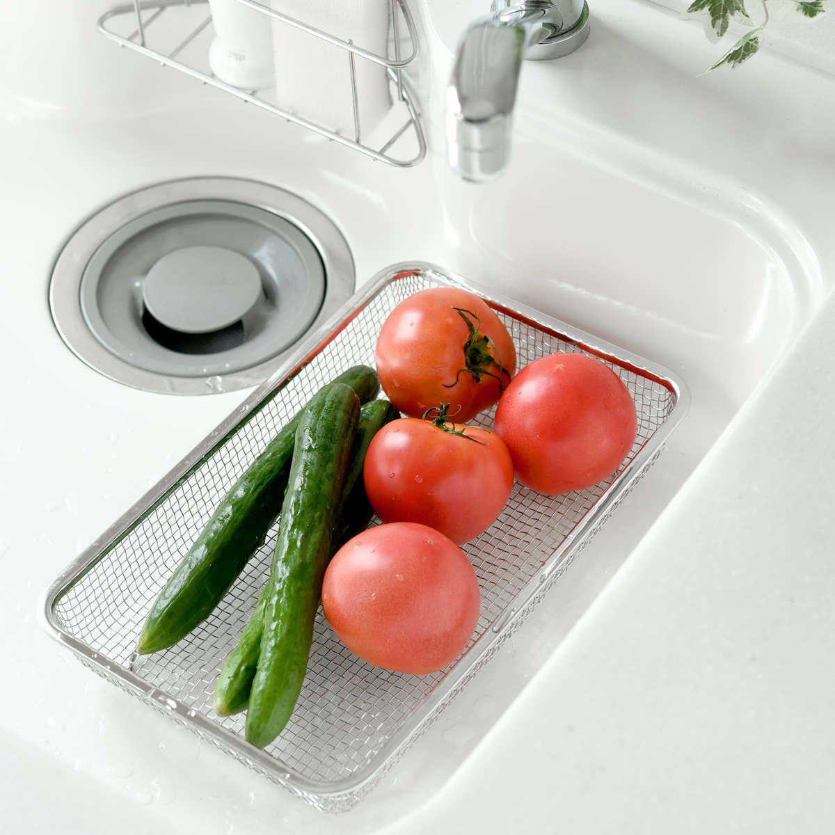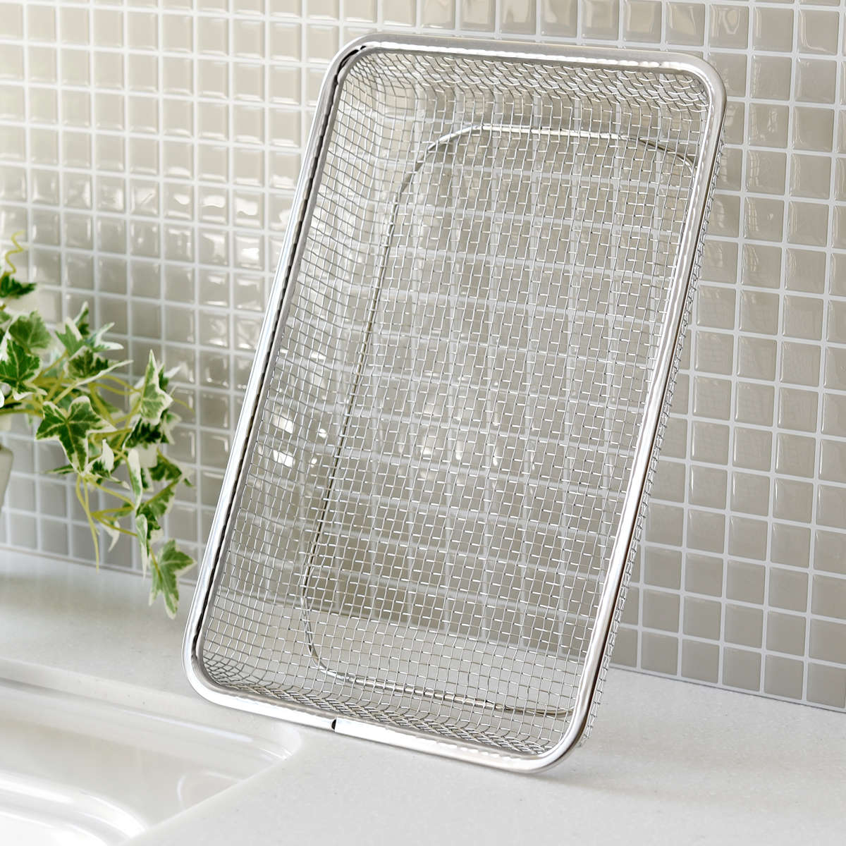 細かい網目構造で、カトラリーやお箸、お弁当グッズ、鍋のフタなどの小物もしっかりキャッチして乾かせます。さらに、鍋やフライパンなどの大きな調理器具も、生乾きにならずしっかり水切りできるので衛生的です。
