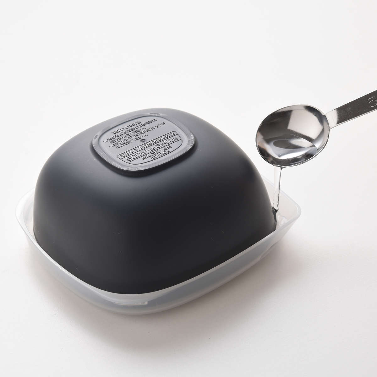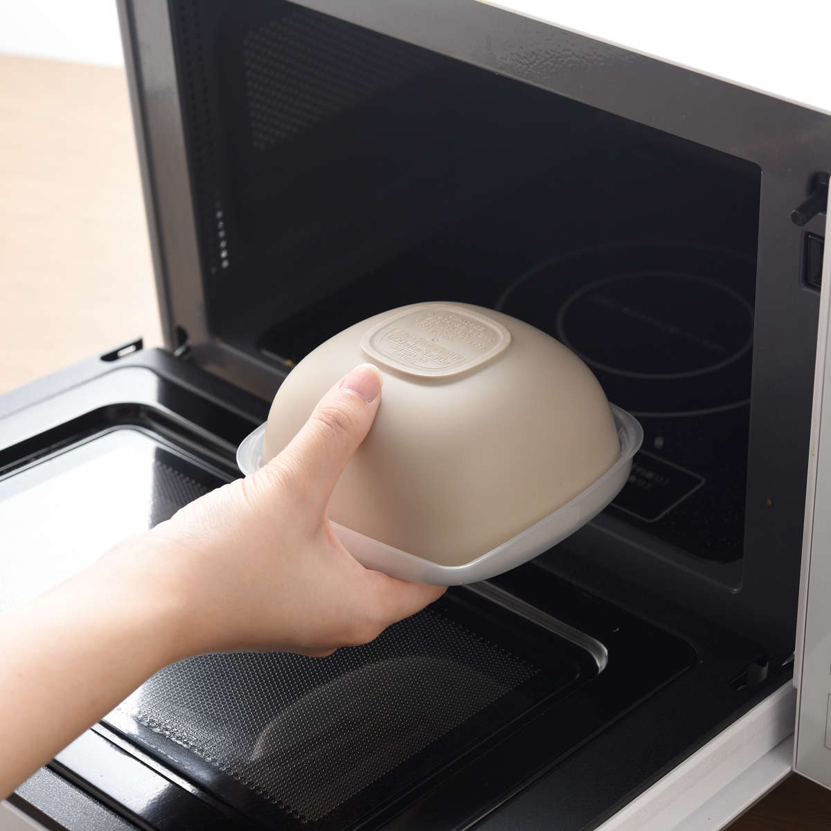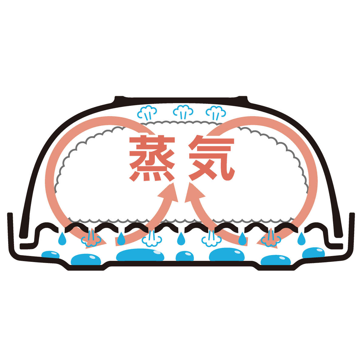 容器をひっくり返して加熱することで、スノコが余分な水分を落とし、蒸気の力でふっくら&もっちりとした仕上がりに。さらに、小さじ1杯の水を加えると、より一層もっちり感がアップします。