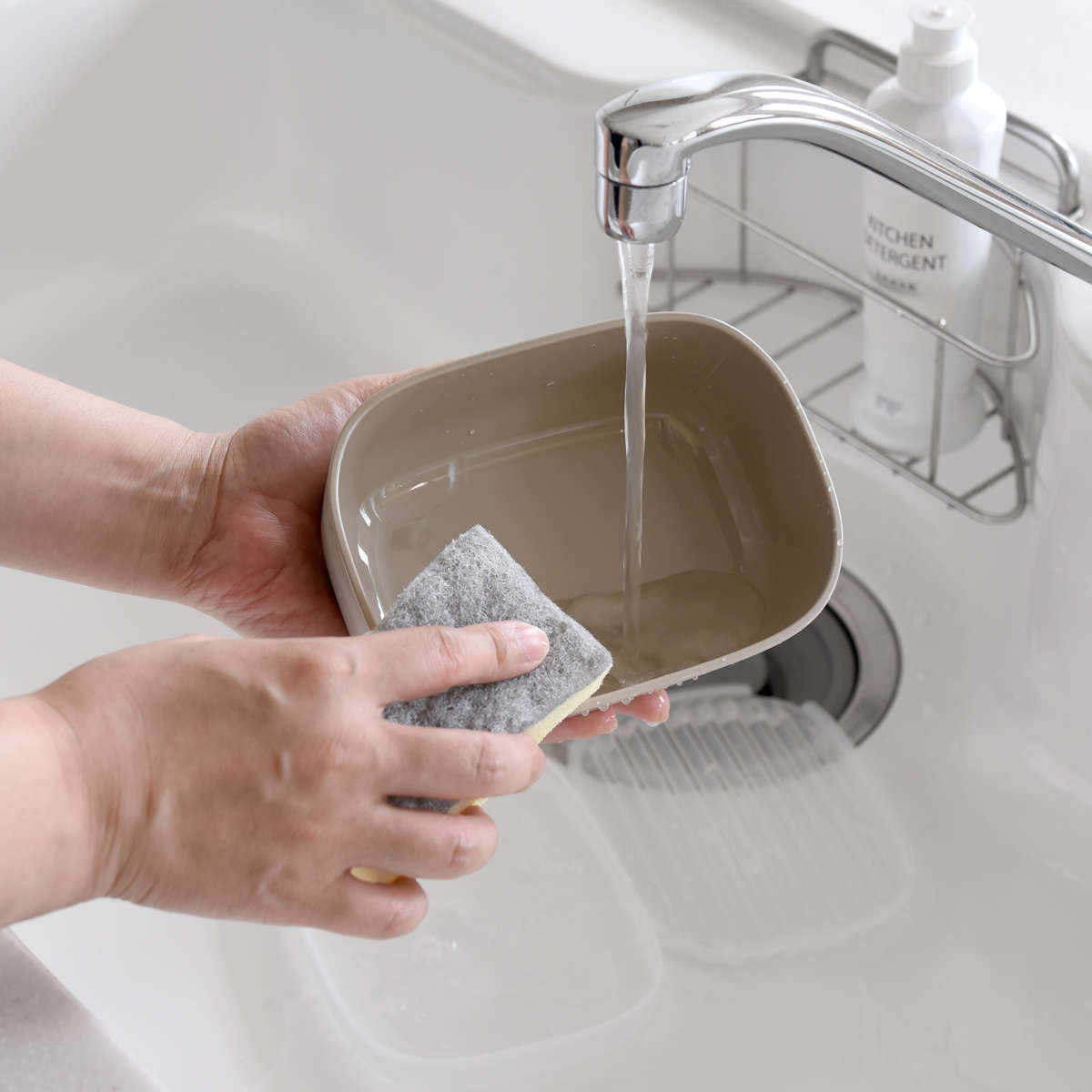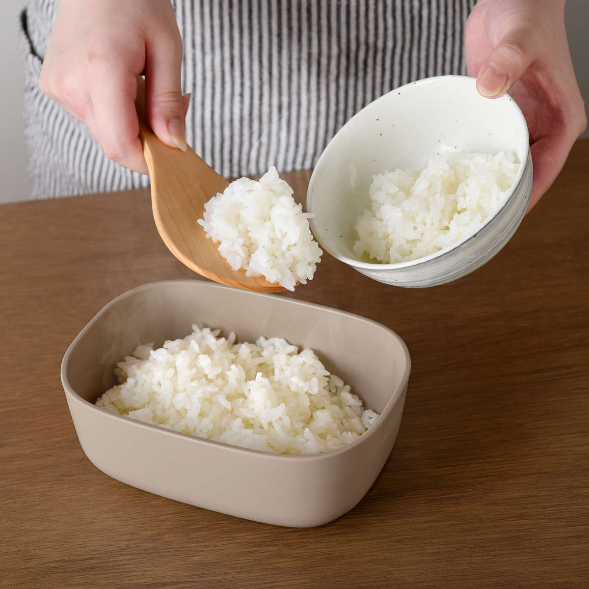 しゃもじにも使われる素材でご飯がつきにくく、フラットな内側でサッと洗えます。スノコはごはん粒が詰まりにくい構造で、清潔に保ちやすく、食洗機にも対応しています。