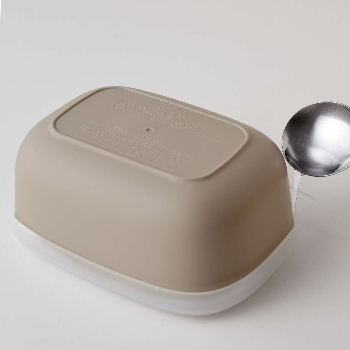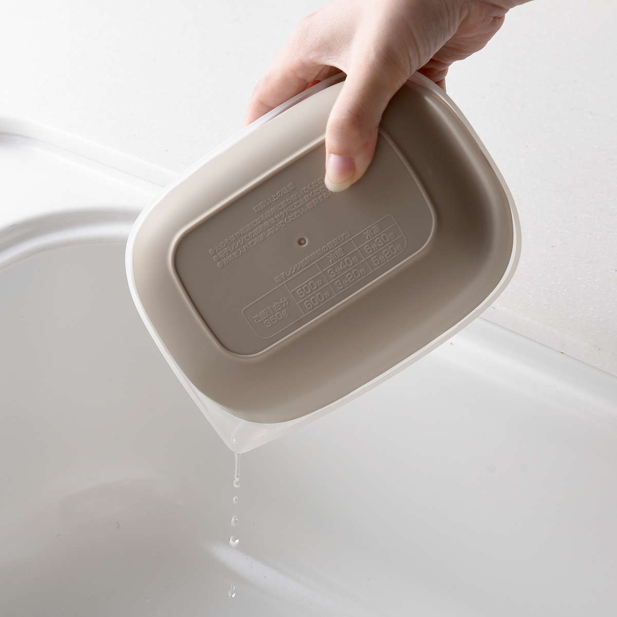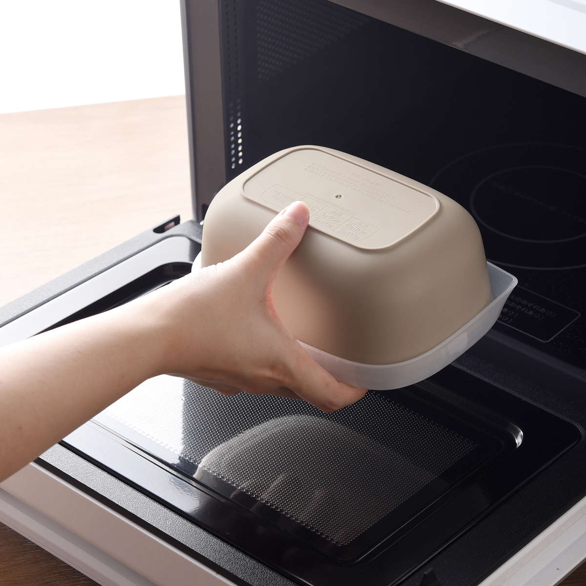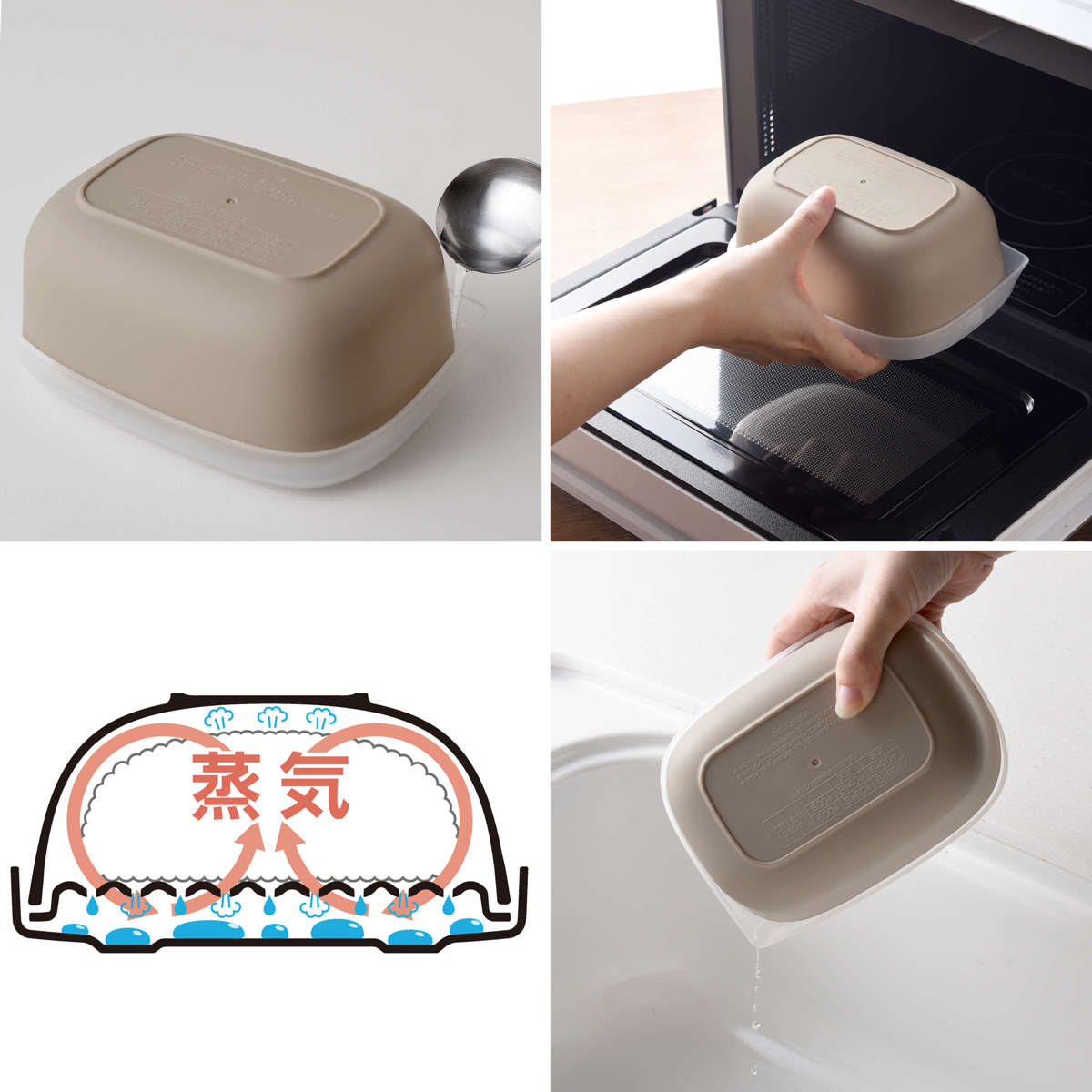 容器をひっくり返して加熱することで、スノコが余分な水分を落とし、蒸気の力でふっくら&もっちりとした仕上がりに。さらに、小さじ1杯の水を加えると、より一層もっちり感がアップします。