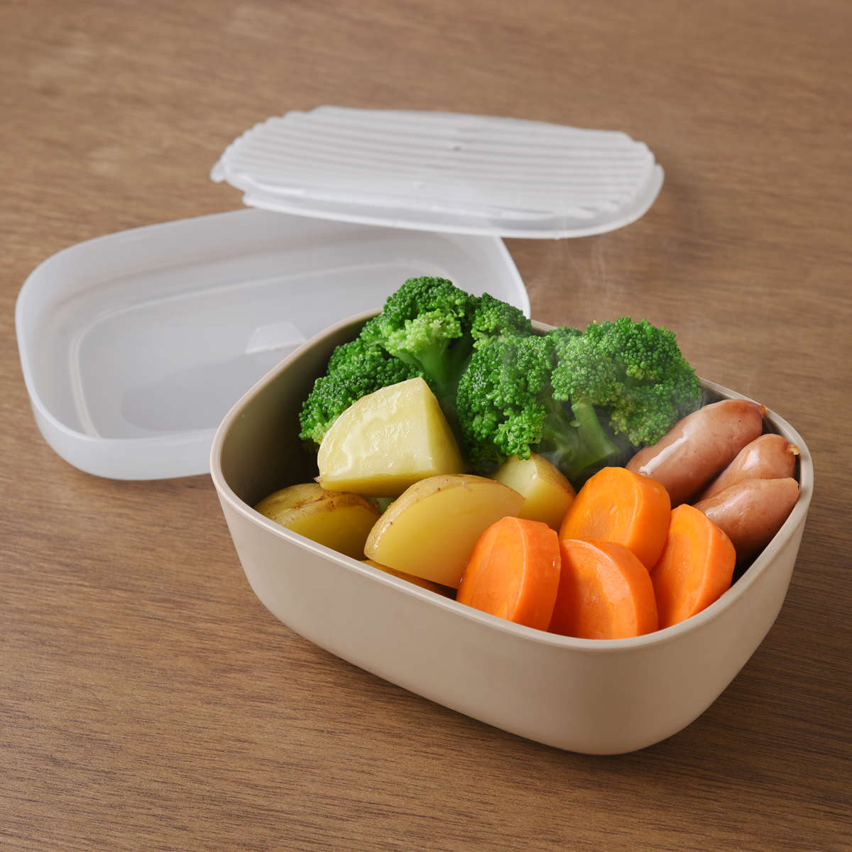独自のスチーム構造で、電子レンジで温めるだけでもっちり食感を再現できます。お茶碗2~3杯分(約330g)のご飯を保存できる、1合サイズのおひつです。