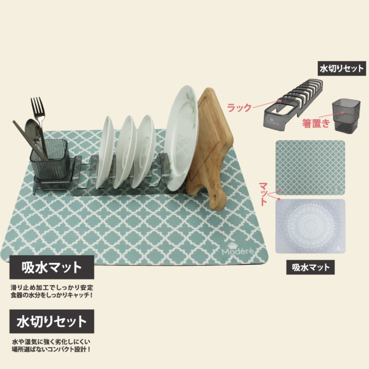 滑り止め加工が施されており、しっかり安定して使える吸水マットと、場所を選ばないコンパクト設計のラック・箸置きのセットです。水切りセットは水や湿気に強く、劣化しにくい素材を使用しています。吸水マットはグリーンとグレーの2種類からお選びいただけます。