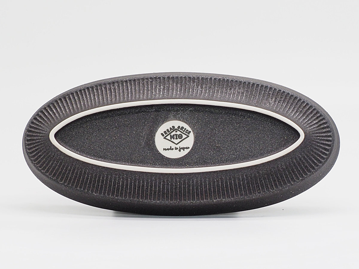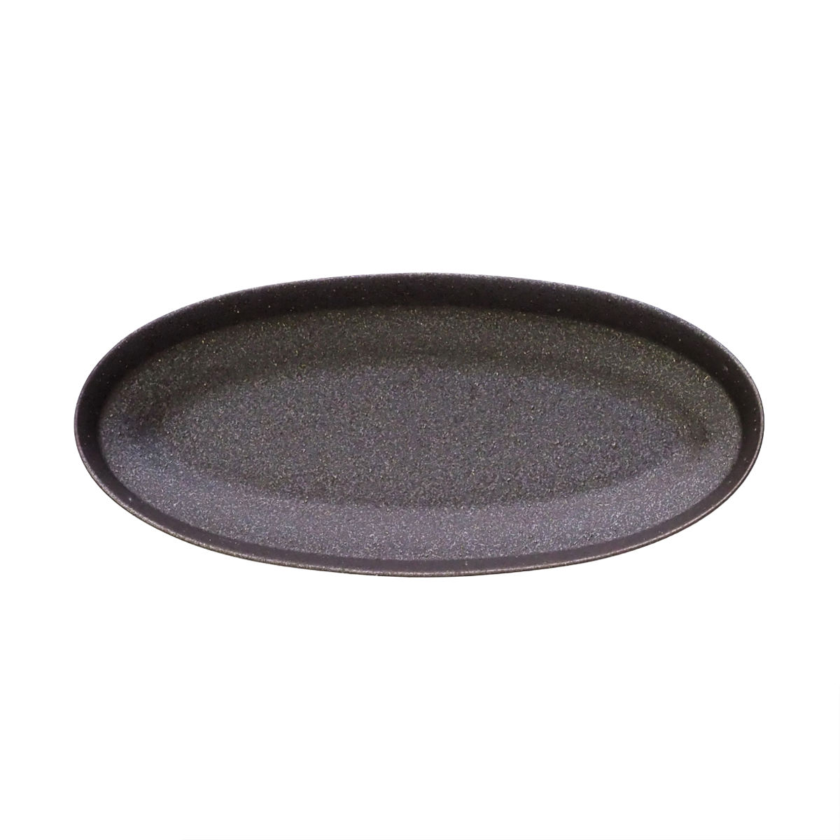 底が少し凹んだ特殊な形状のお皿です。その凹みが自然と「ここに盛ろう」というガイドになり、盛り付けた料理がぐっと映えます。表面はザラッとした質感とシックな色合いで、和洋問わずどんな料理にも馴染みます。横長の形はサラダや前菜、メインなどを盛り付けやすく、家族やゲストとシェアする食卓にも最適です。