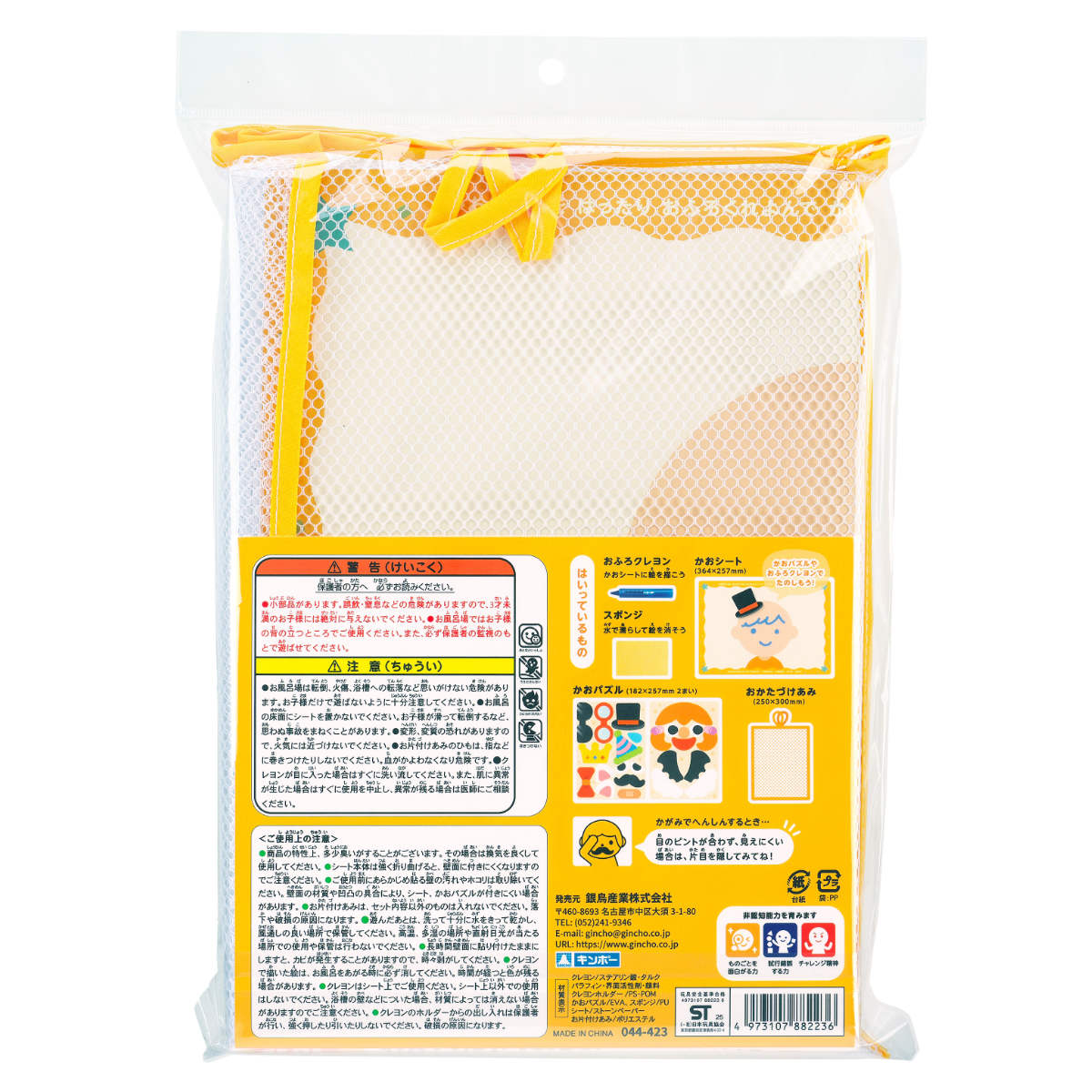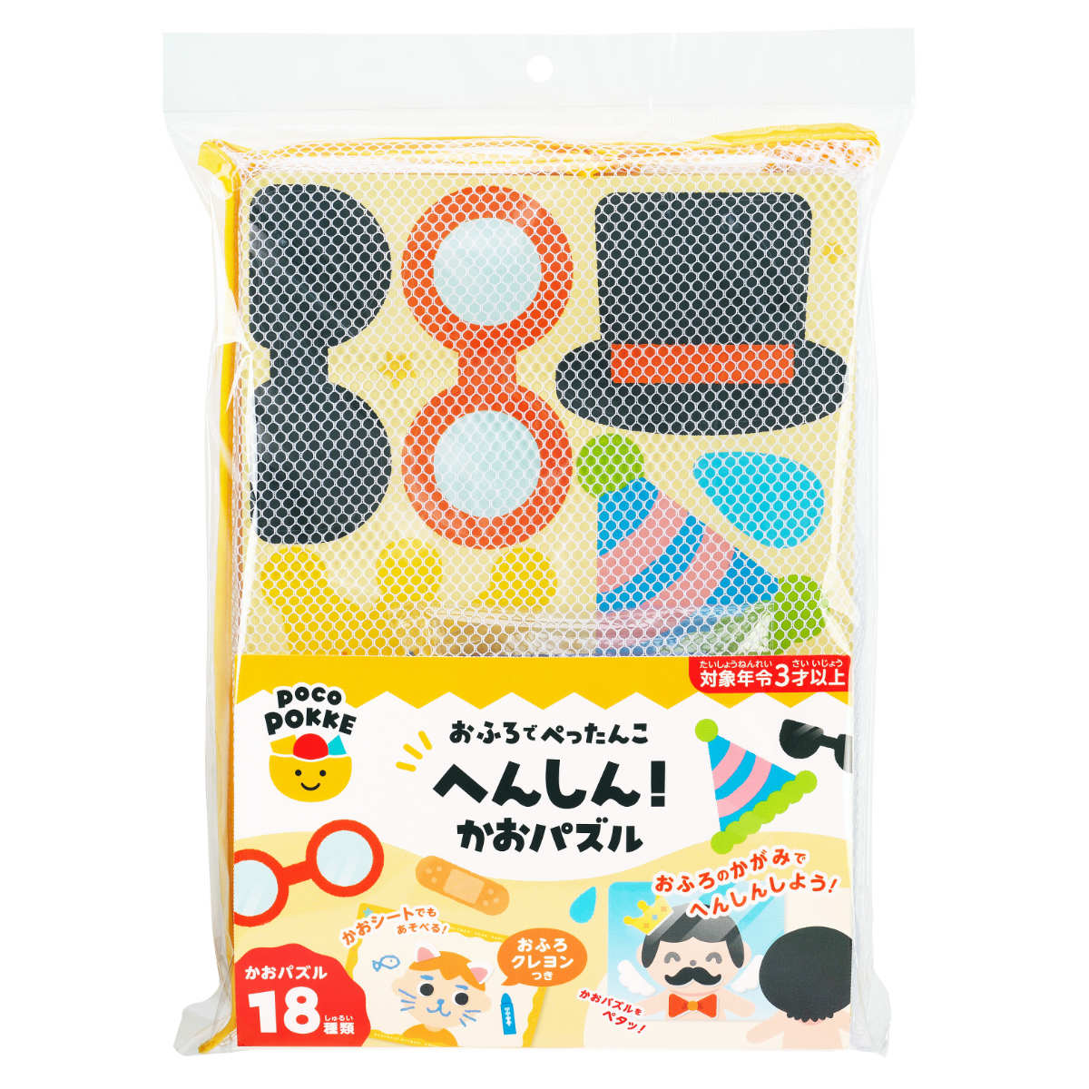 めがね・ひげ・ぼうし・蝶ネクタイなどの顔パーツが18種類。貼って遊ぶうちに、想像力・観察力が育まれます。水切れの良いネット付きで、乾きやすくお片付けも簡単。衛生的に保管できます。