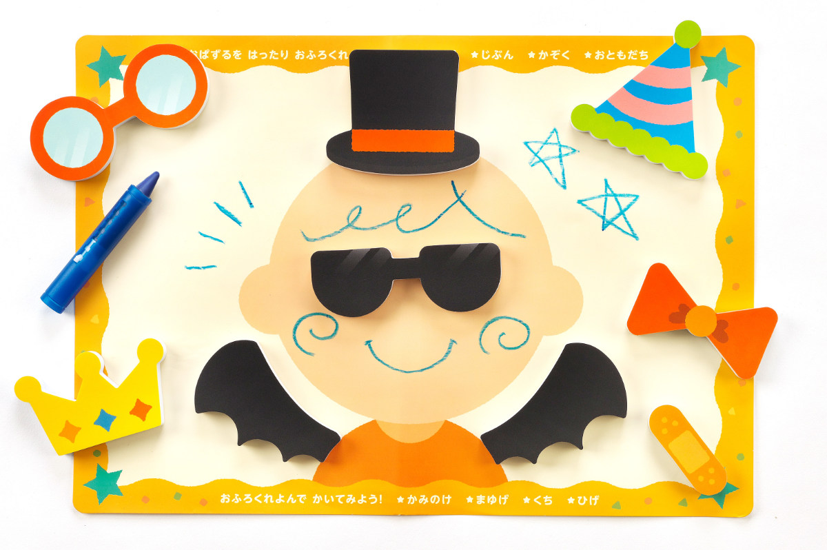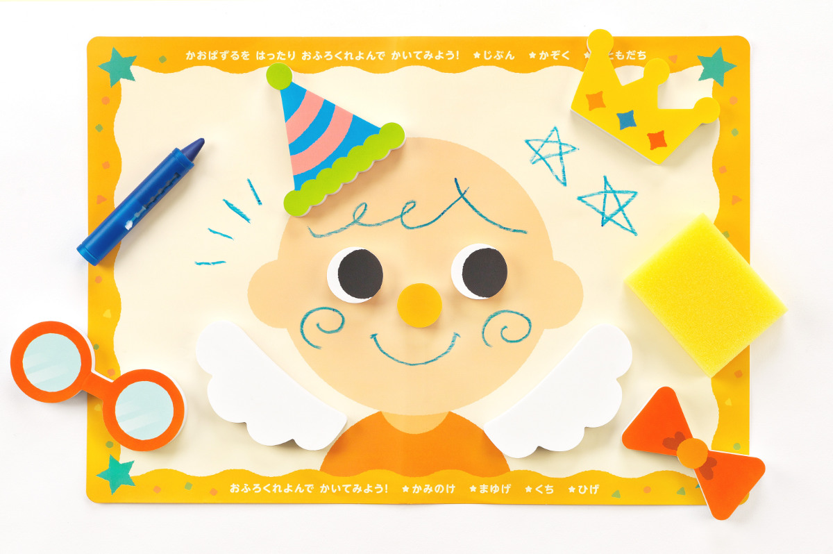 顔パーツを自分の顔に貼って遊んだり、台紙に貼って遊べます。付属の青色のおふろクレヨンで、お絵かきもできます。おふろクレヨンは水を含ませたスポンジで消すことができるので、繰り返し遊べます。