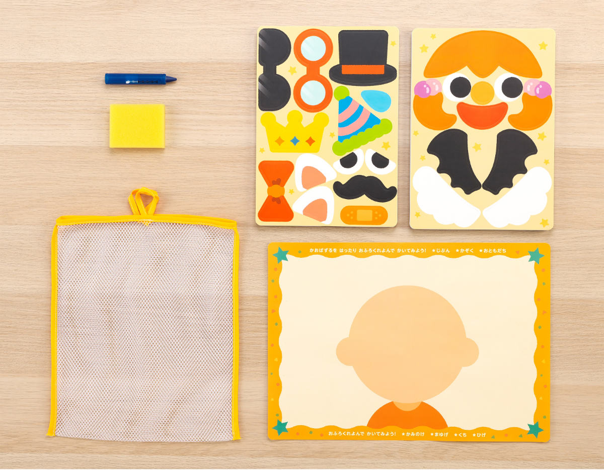 | 内容量 | 青色クレヨン:1本 かおパズル:2枚 スポンジ:1個 かおシート:1枚 お片付けあみ:1個 |