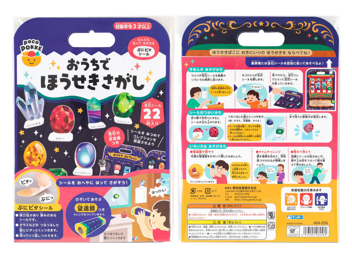 パパやママがお部屋の好きなところに、宝石シールを貼ります。お子様は、付属の望遠鏡で宝石を探します。見つけたら、宝石コレクションに宝石シールを貼って遊びます。親子・兄弟姉妹で、探す時間を決めて何個見つけられるかタイムチャレンジをして遊ぶのもおすすめです。