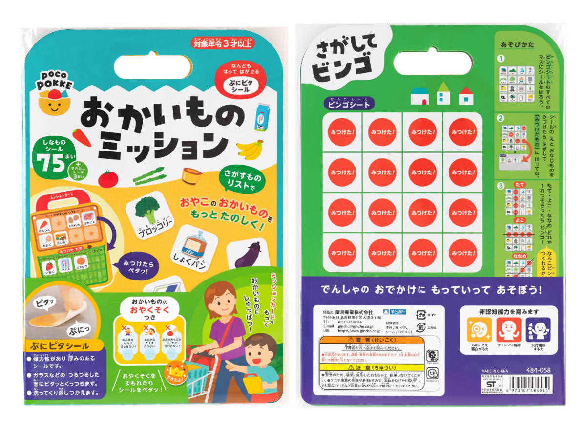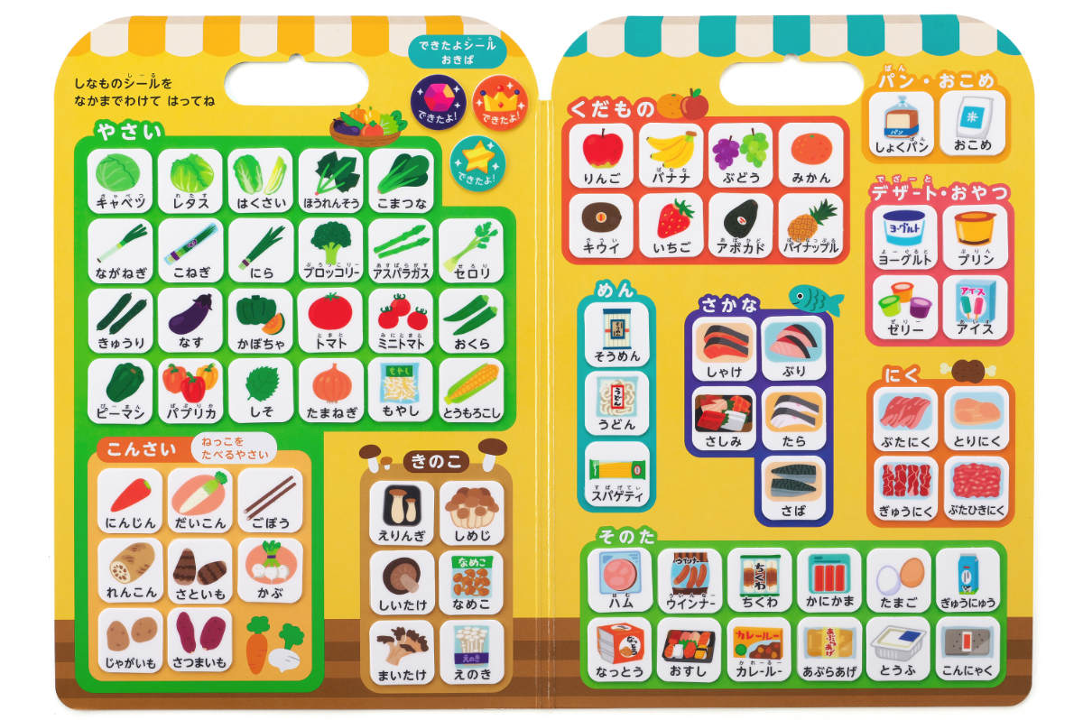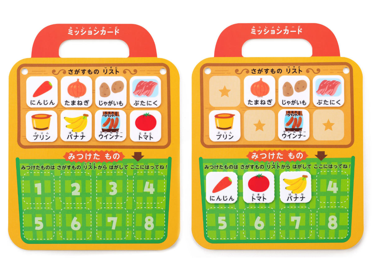 ママがお子様に探してほしい品物を選んで「さがすものリスト」にシールを貼ります。お子様は、「さがすものリスト」の品物をスーパーで見つけたら、「みつけたもの」に貼り直します。親子でコミュニケーションを楽しみながらお買い物ができます。