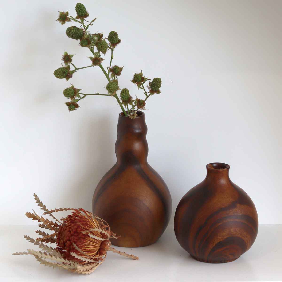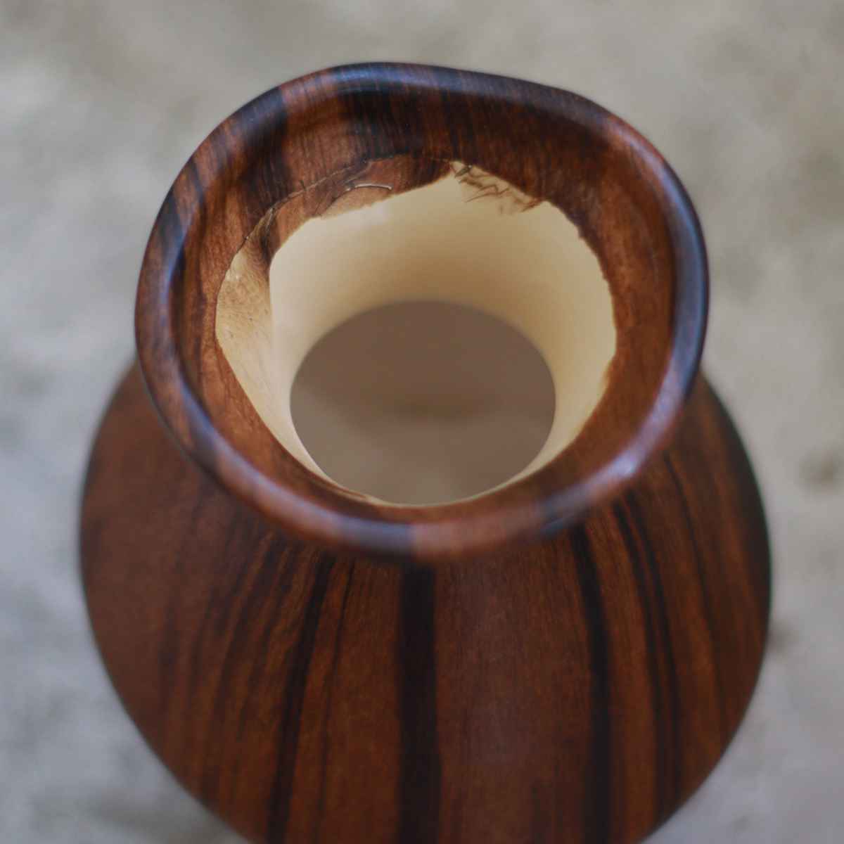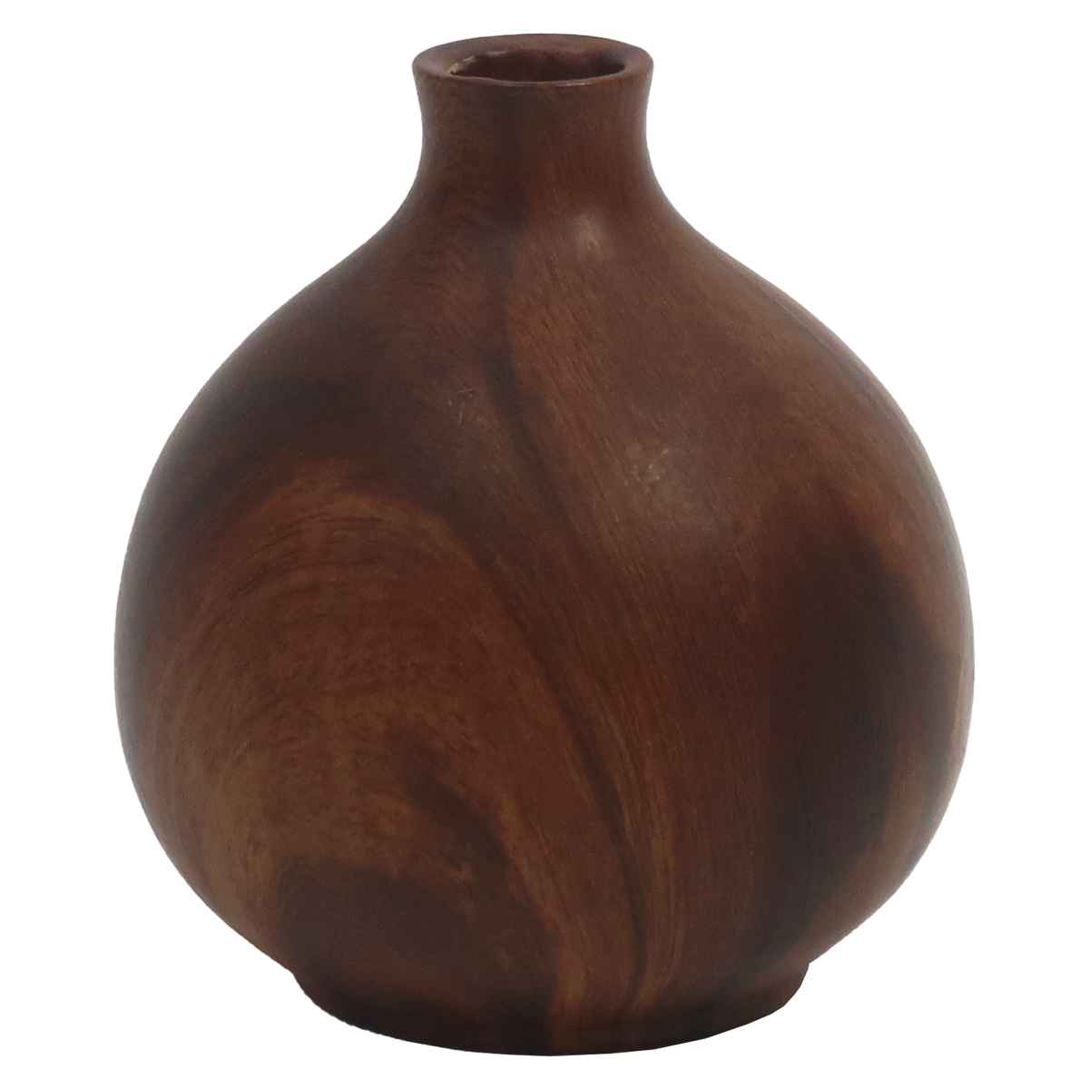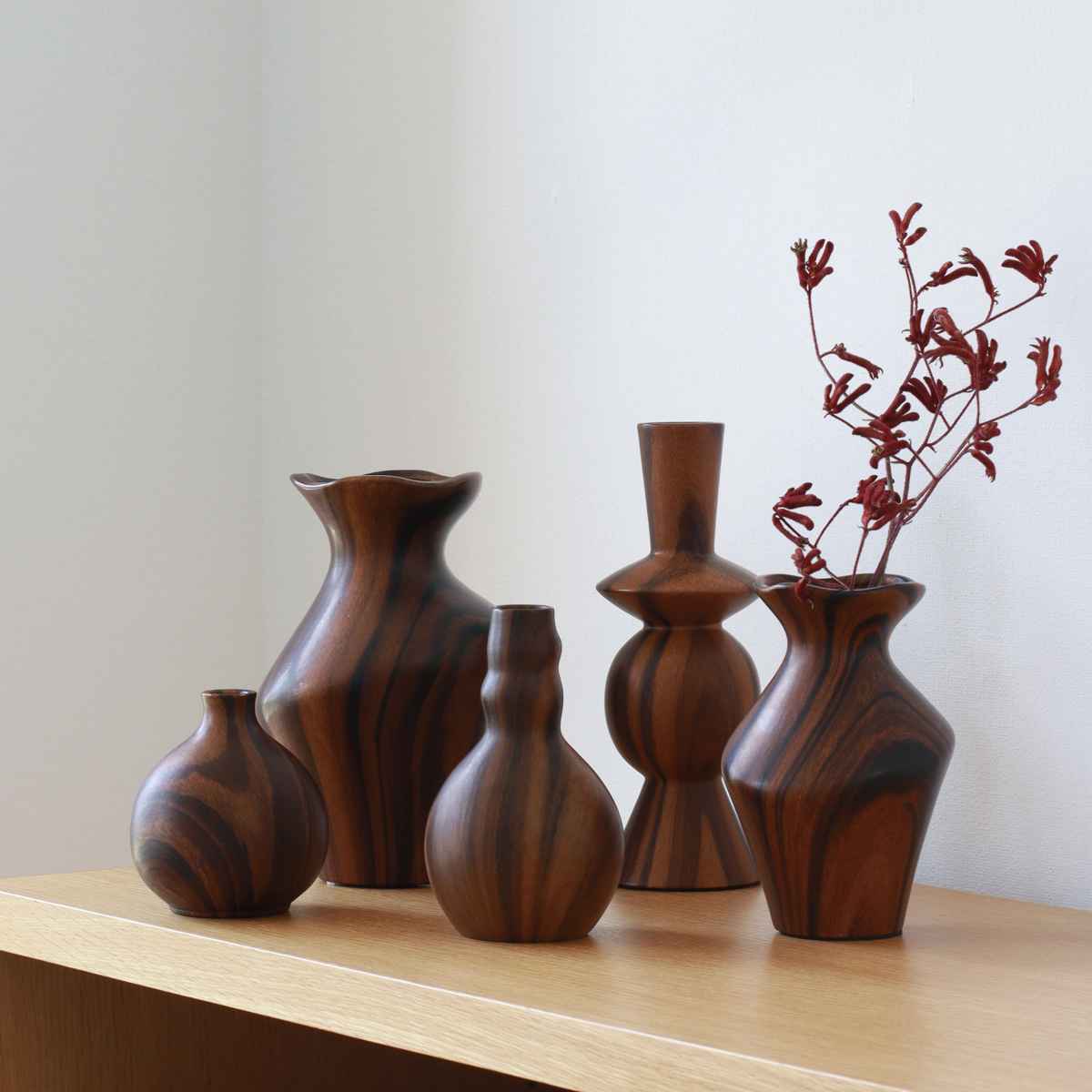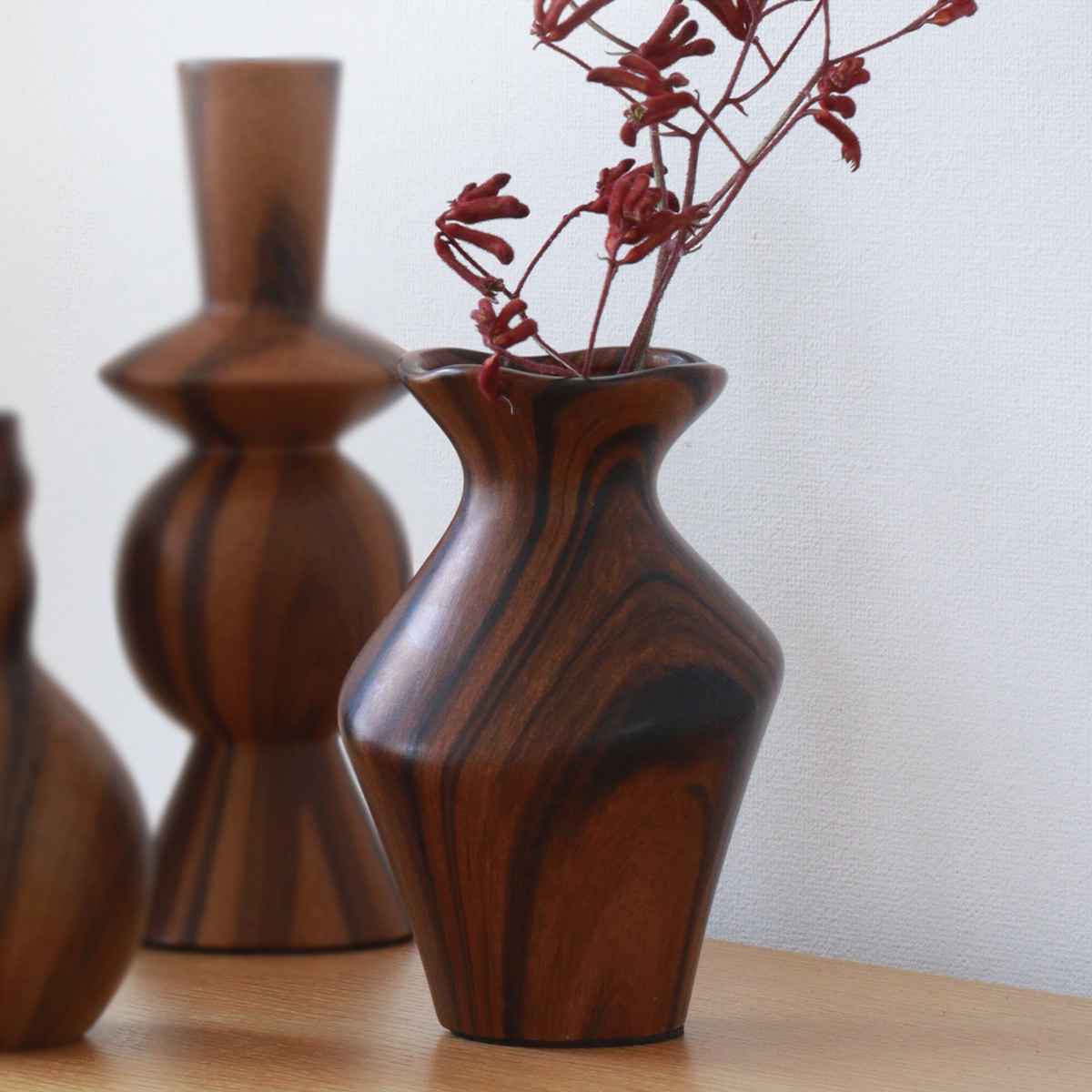 木のぬくもりを感じさせる陶器製のフラワーベースです。ユニークな形状と木目の存在感が空間を上品に引き立てます。