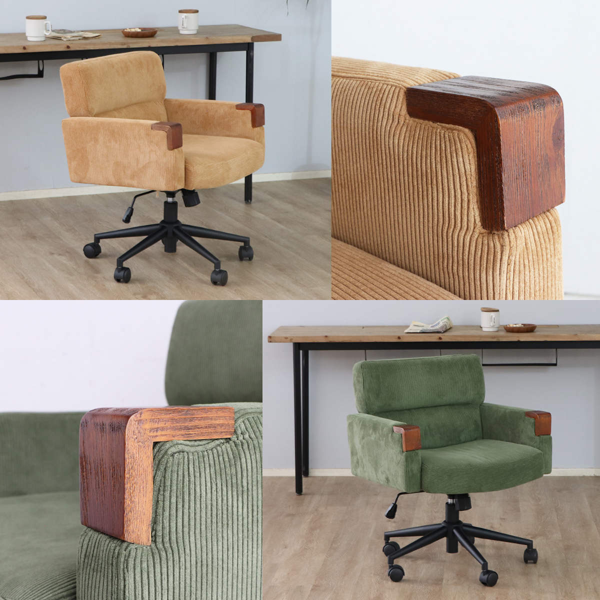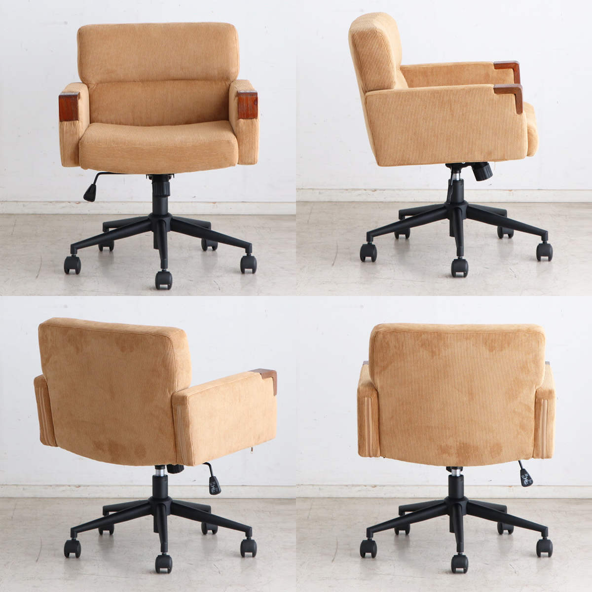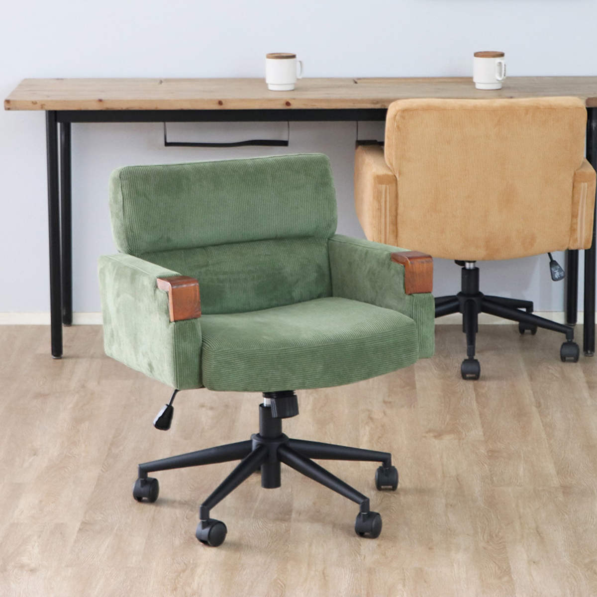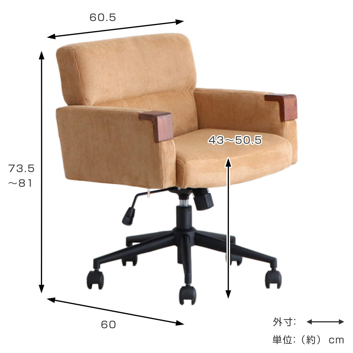 座面は43~50.5cmで、レバー操作により自由に高さを調節可能。デスクや体格に合わせて快適に座れるだけでなく、柔らかなコーデュロイ生地と木目のアクセントが温かみのある落ち着いた雰囲気を演出します。