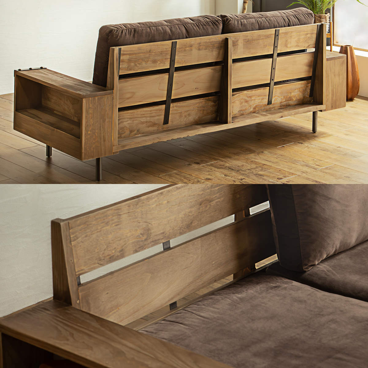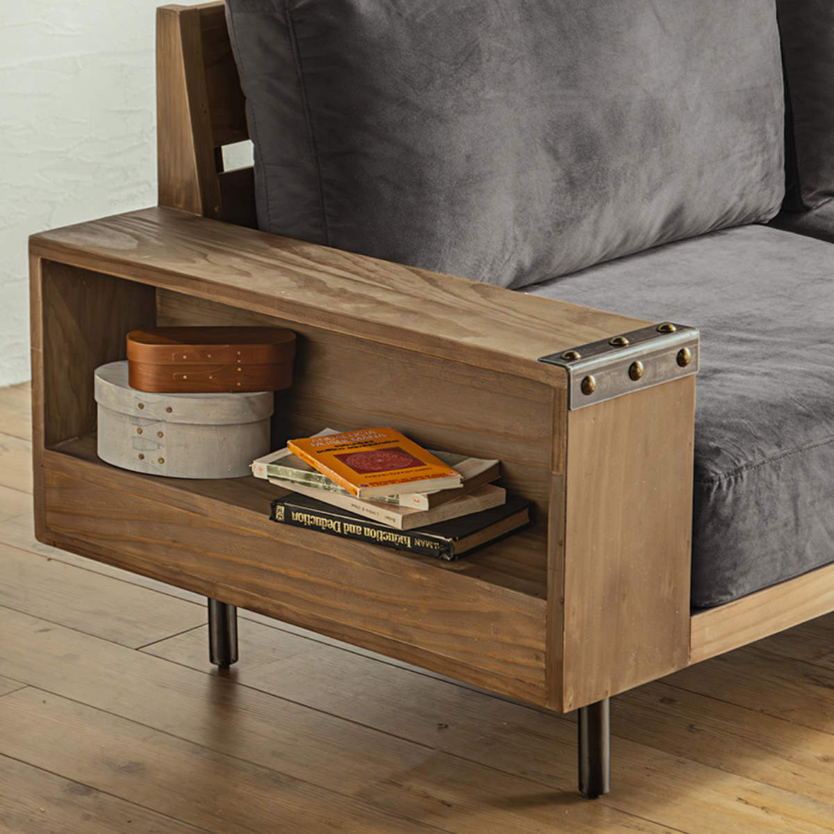 肘掛の中が収納棚になっており、本や小物をすっきり収納可能。ディスプレイも楽にでき、使い勝手と趣のあるデザインを両立させています。