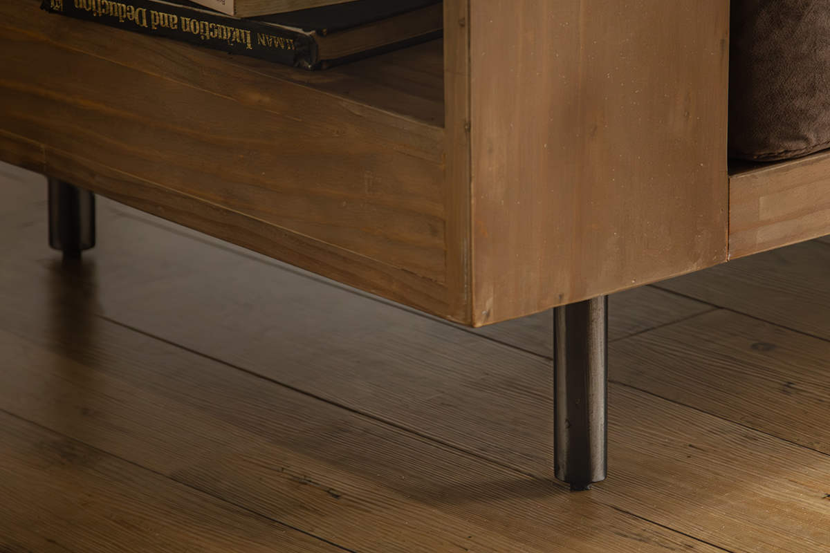 天然木パイン材の味わい深い木目と温かみを活かしたヴィンテージ風仕上げ。木材とアイアン風スチール脚の組み合わせで、大人の落ち着いたリビングを演出します。